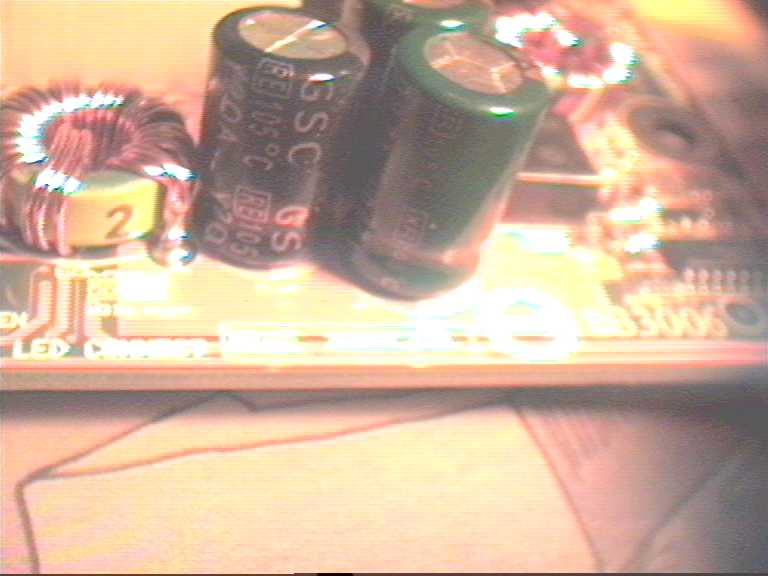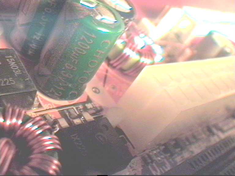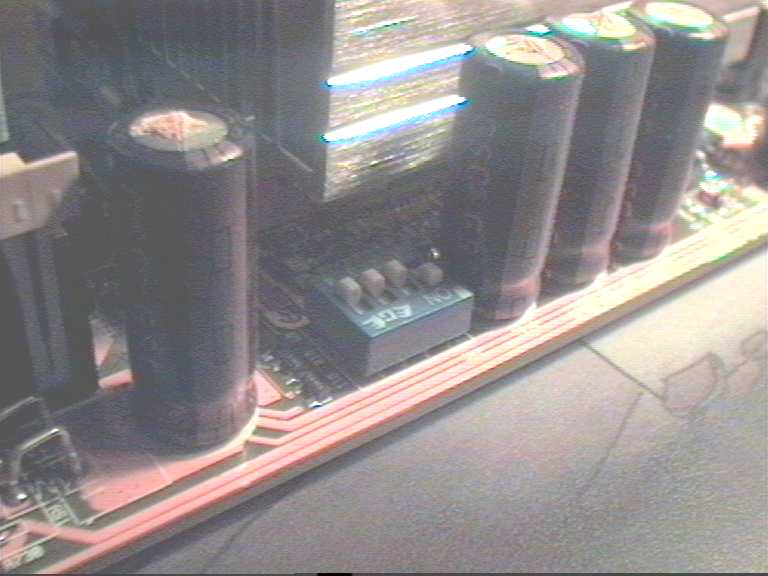 This time, the caps around the CPU are CHOYO and are not bulged (at least now ). Three small GSCs are bulged - one black 330uF/25V and two green 1200uF/6.3V. The weird thing is that there are 2 different types of black 330uF/25V caps on the board - 6 G-Luxons (all OK) and 2 GSCs (one of them bad).