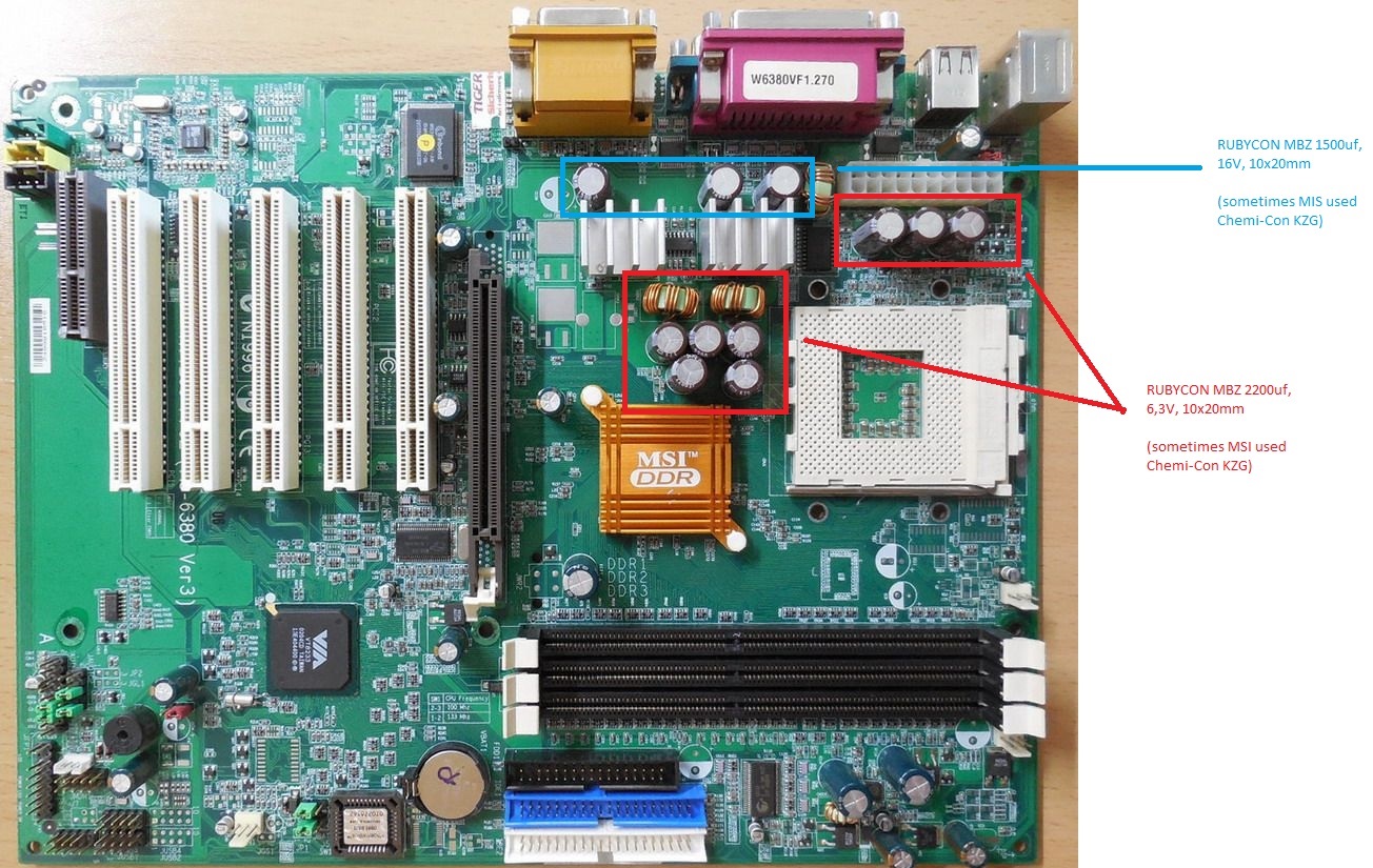 I figured out that MSI also put Chemi-Con KZG on other KT266 boards, but same like the MBZ there is in my understanding no direct replacement available nowadays. Many posts in forums are quite old.