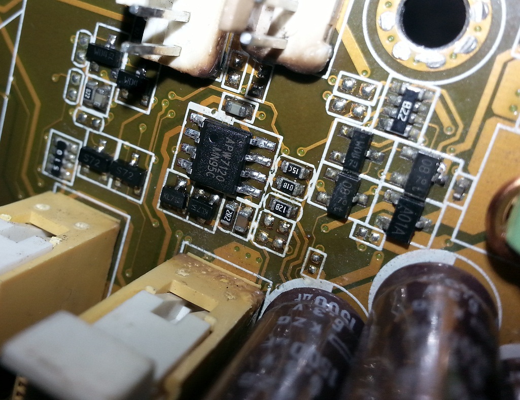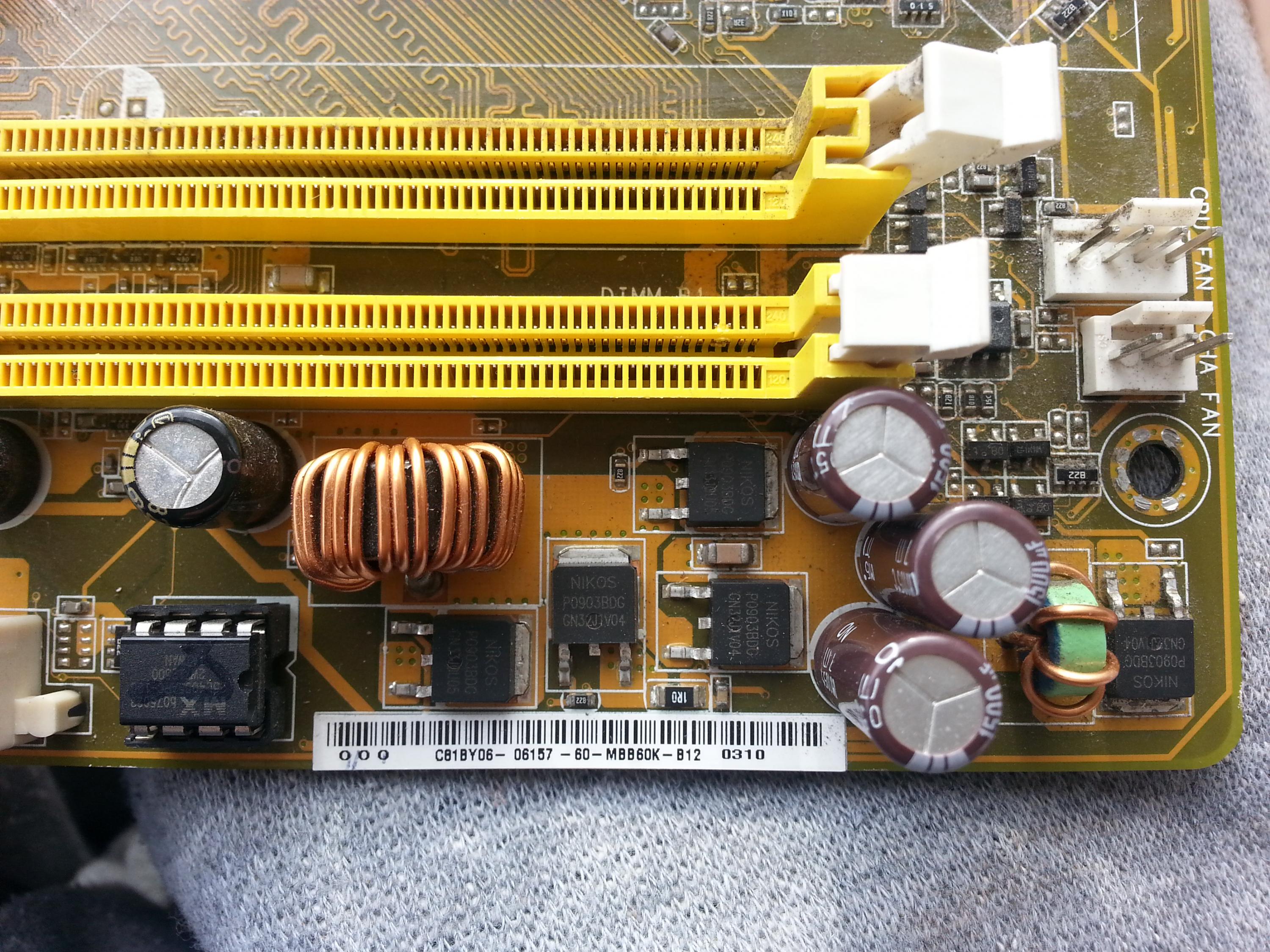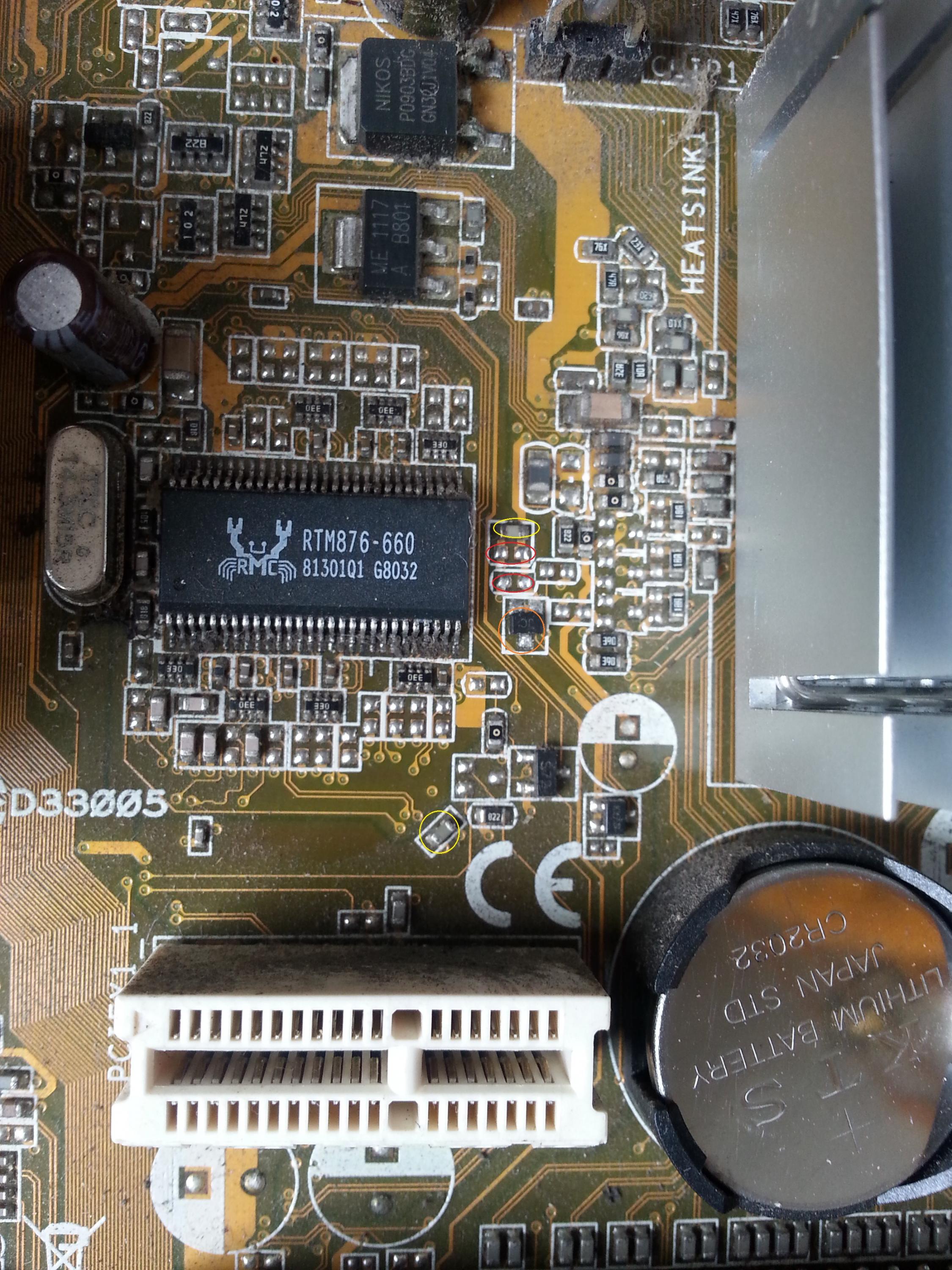On the front side of the board, in the same vicinity, there is the upper and lower mosfets (directly above "0310" on the barcode sticker in the attached photo) who's gates are connected to the POU1 chip.