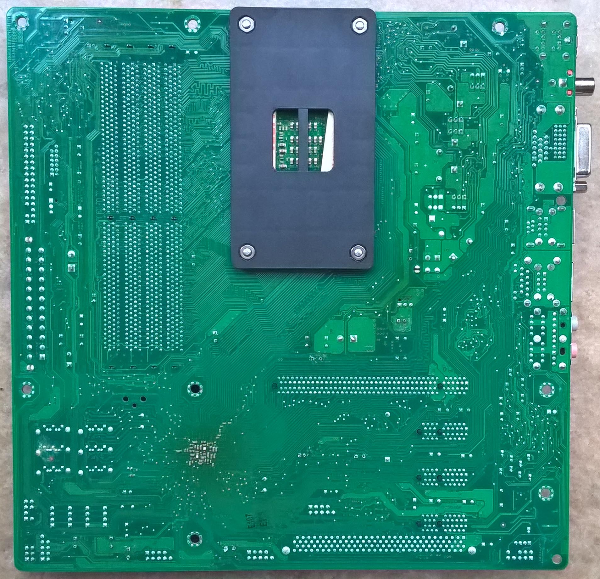 The chipset is a GeForce GF8100P-A-A2. Are these affected by the bumpgate? And if so, would you say I'd be wasting time trying to reflow it again? I have a similar Pegatron motherboard from another HP PC from that repair shop. Not sure if it also is an M2N78-LA or not, but from what I could tell when I had it opened, it was the same board, but only with 2 RAM slots, and IIRC also a few other ports missing. It came out of a lower-end HP Pavilion, and thus only packed an Athlon II X2. That PC ended up working fine, though. I added a small 40 mm fan on the chipset / MCP heatsink, and it seems to run adequately cool. I don't remember if that board had the same kind of PCB burn / darkening as this one, though.