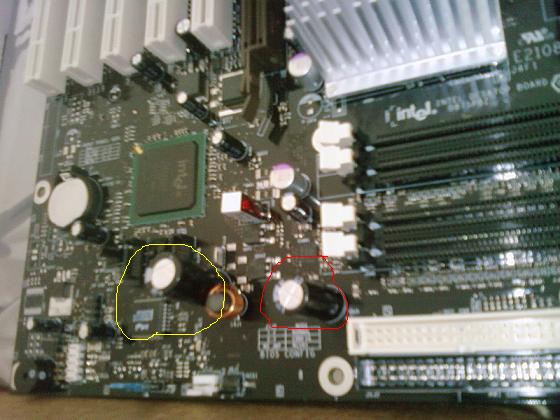 I just got a brand new zero hour D875PBZLK C27085-209 and was wondering what the Nichicon HD 1500f 10v does? Its Between the sec. IDE and Dimm socket (circled in red). Next to it is a Rubycon ZL 2200f 16v with a resistior coil (circled in yellow). I am going to recap the KZG and KZE's in the vrm and regulator with Rubycon. I want to replace the HD with a Rubycon, but I don't know if the Nichion HD is a filter for the rest of the Nichions on the board. I would like to get rid of all the Nichicons all together for some Samxon. The Dimms are powered by some nice Sanyo and 1500f 6.3 Rubycon. Should I leave the Nichion HD alone? Has there ever been any problems with the HD series?