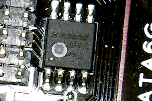 So questions: has anyone seen this behaviour before? Are my Vcore reading normal? and, lastly, could it be a faulty BIOS chip? - I noticed a strange indelible white mark on the Winbond chip (which I cannot identify btw?) and have included an image.