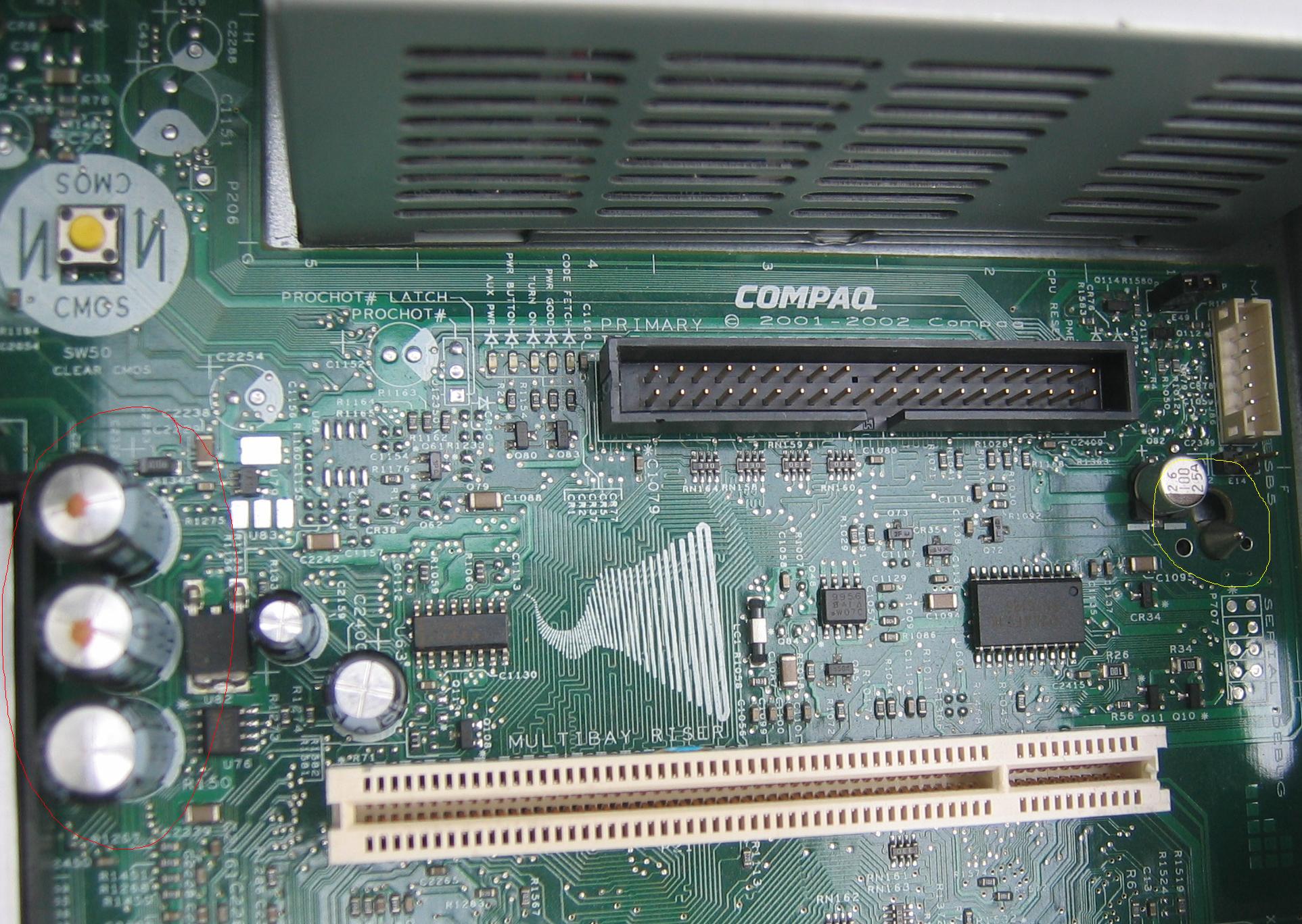 I purchased an used Compaq EVO D510U (Ultra-Slim Desktop) and while it boots (I can't do any more testing because I don't have an USB keyboard and can't get past POST), I noticed 3 leaking capacitors and 1 bulged one. These desktop is very compact and may not have very good cooling?