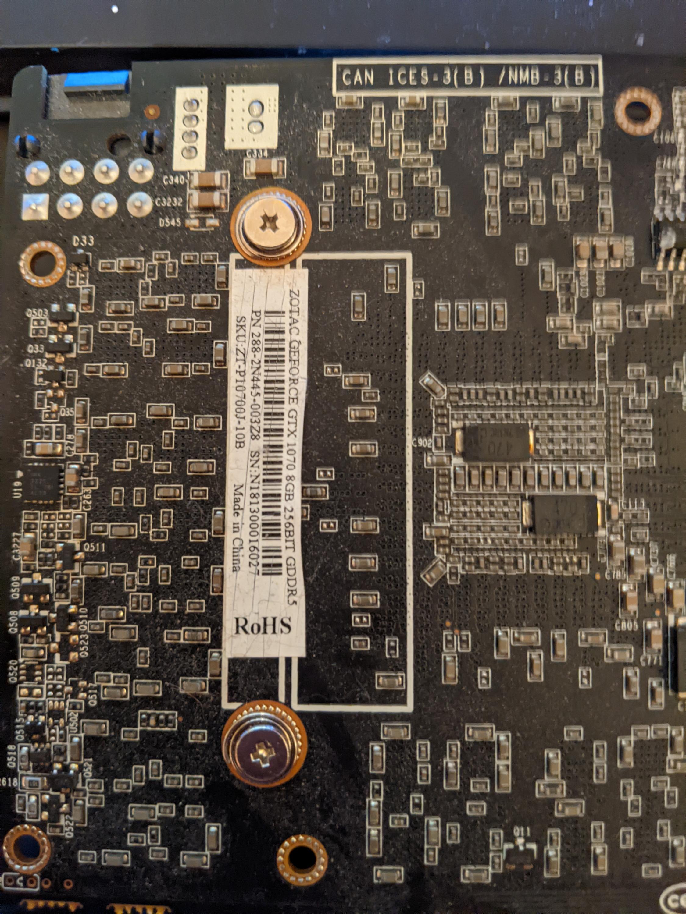 I walked down and found my PC off the other morning and it would not restart. I opened it up after disconnecting the power supply and got sparks on the back of the 1070 PCB when I tried to power it back up. I was able to identify 3 damaged capacitors (I think) opposite of the Mosfets (again, I think). I was pretty sure since they had their own heat sink but after pulling the GPU cooler to look at the rest of the board I see some large components next to large capacitors that I can't identify. C323, C389 and C621