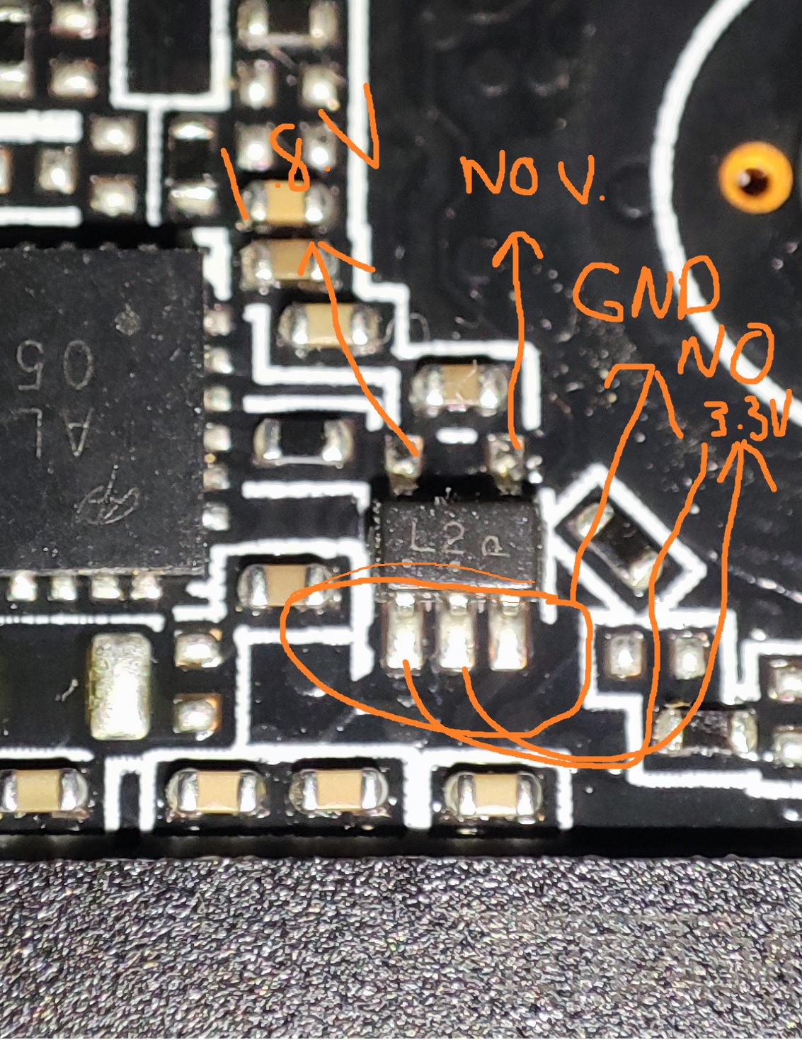 The card doesnt have the u 503 installed and doesnt appear to have been ripped off but does have the 0.05 ohm resistor installed that bypasses the u503, but i will check the u503 pads for 3.3v anyways (i think its meant to be 3.3v, it is on my rx580s not sure about 3000 series) the 0.05 ohm resistor reads 0.1 on my meter which is basically as low as it goes so i assume its ok, i dont have any voltage on either side of it anyways. i will try to probe the A11 pin for supply voltage when i have a mining card riser free as its a bit tricky to do on my test motherboard