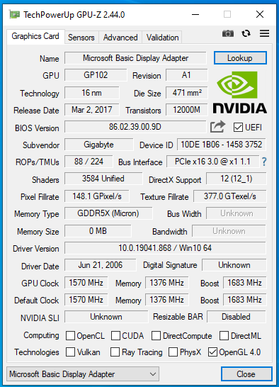 Only thing to add is that if I boot blind with the card as primary and connect via RDP to windows, it now shows all info in GPU-Z apart from memory size (if nvidia drivers install then get blue screen).