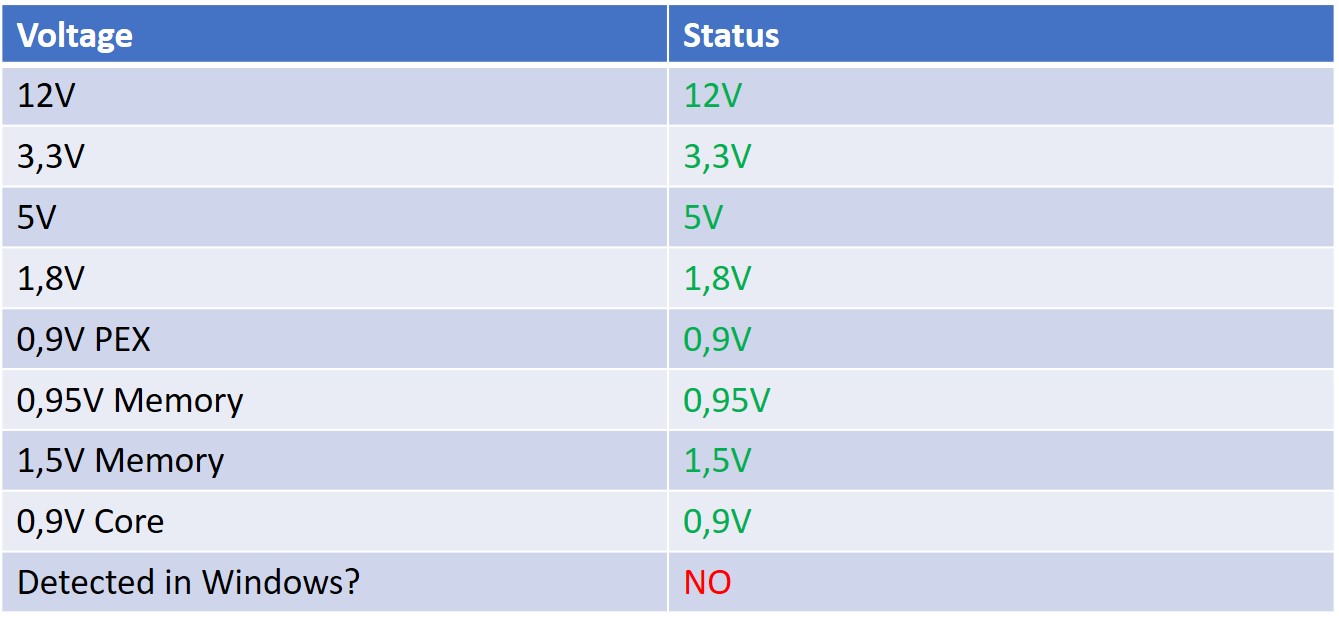 It looks like all voltages are present but card is not detected (does not appear in device manager).