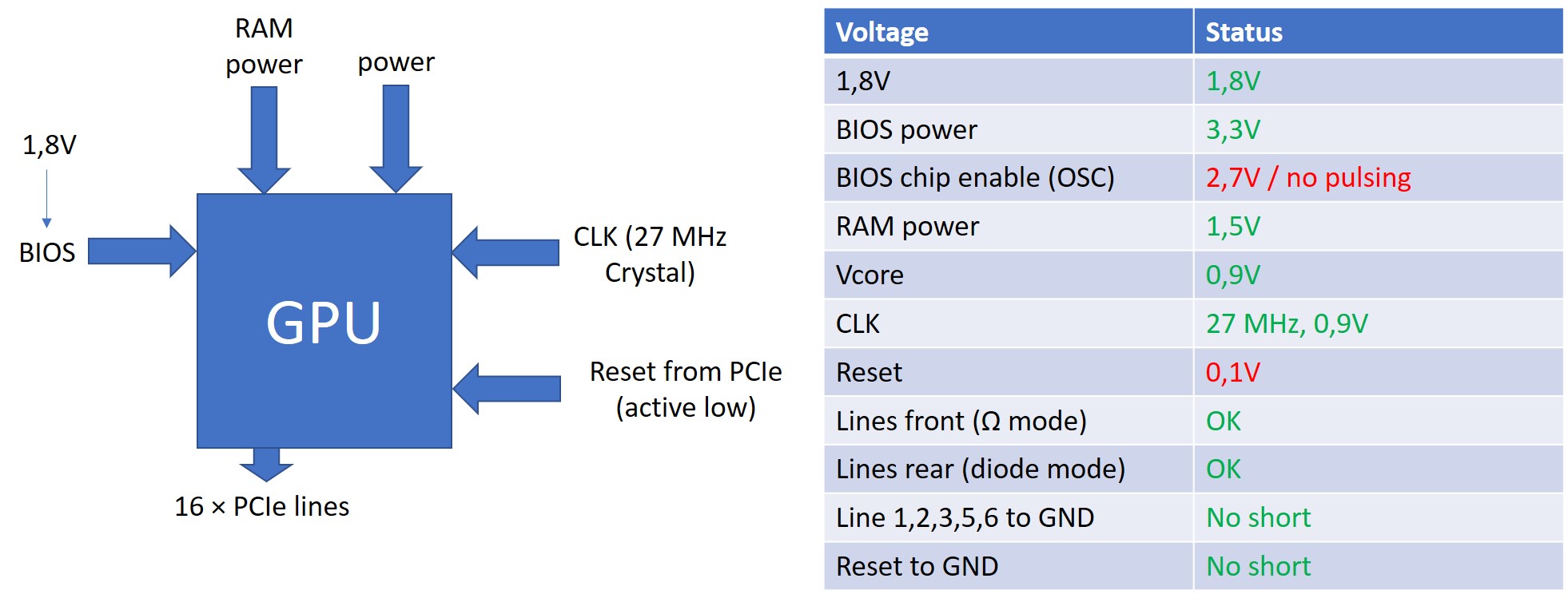 I have done some more measuring around actual GPU. No shorts on PCIe lanes, no shorts on reset and 5 & 6. Reset has low reading (aroun 0,1V), GPU has power and clock.
