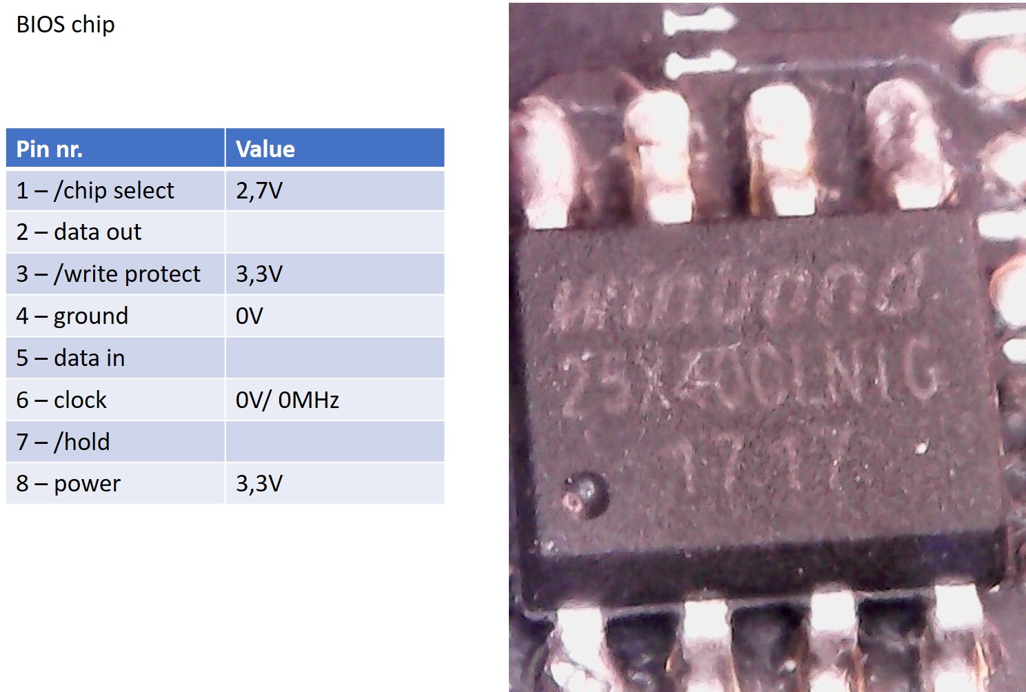 After that I checked BIOS chip. It does have power however chip select never goes low. Also BIOS chip does not have CLK present (0V/0MHz). Not sure what values should be here, but probably not 0. If I understand correctly the schematics for RX 4XX/5XX series, BIOS CLK comes directly from GPU.