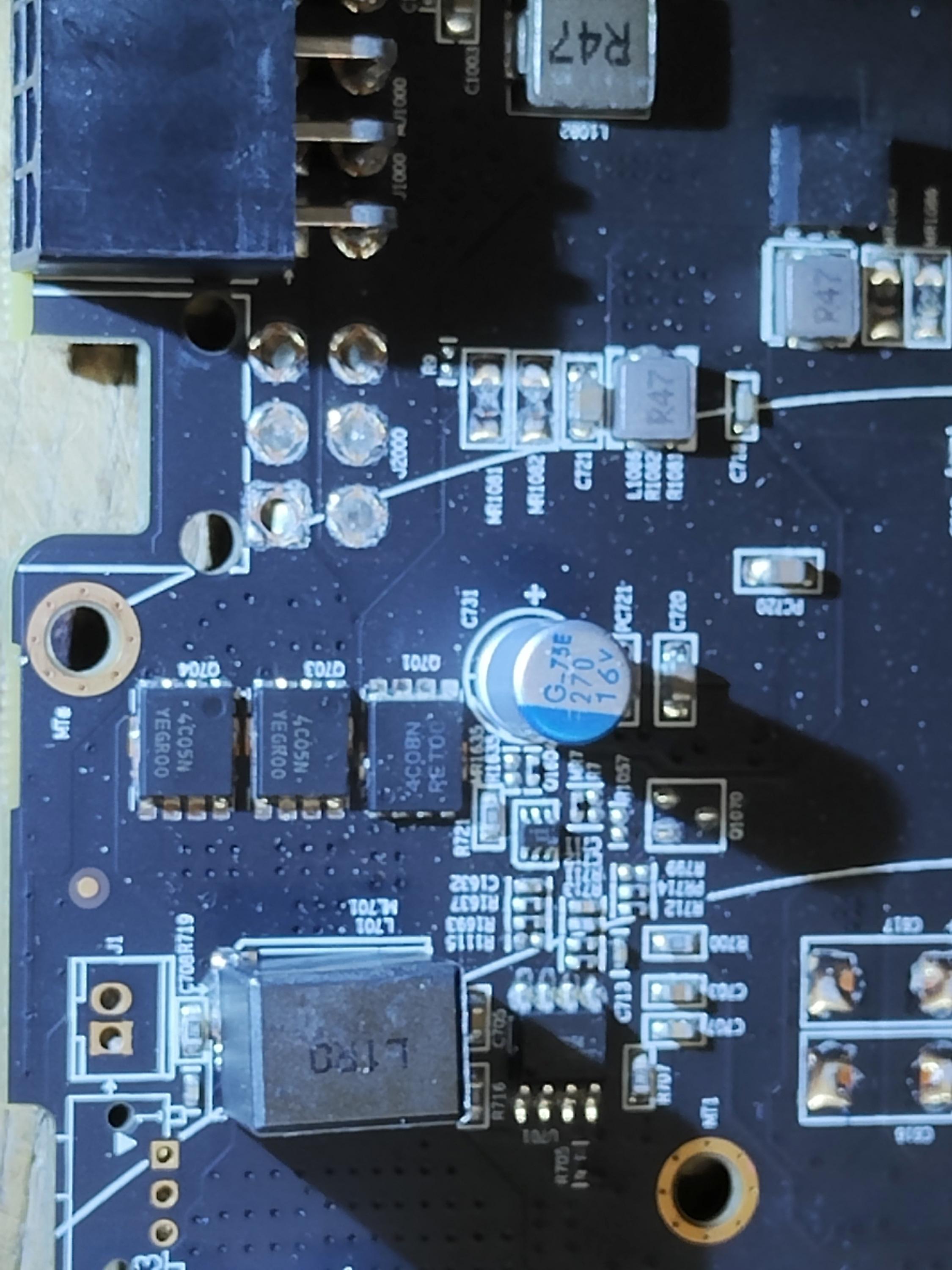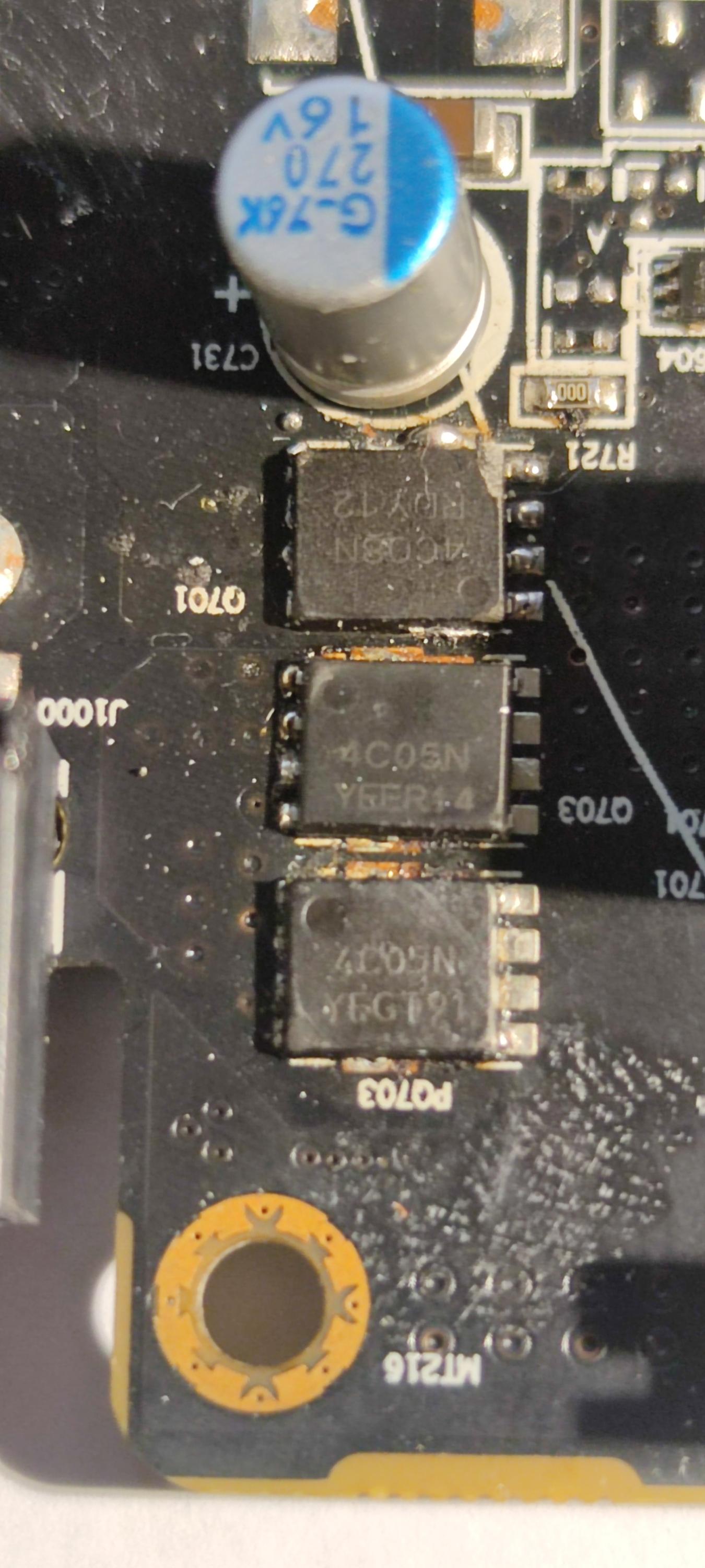 Hello to everyone, I've bought a not working Powercolor RX580 8GB to try to fix it; Immediately with a multimeter I've seen that on 12Vdc that we can found 8pin and 6pin connectors there is only 700Ohm between the 12Vdc power line and GND; also someone has tried to rework the board, I've seen both mosfet 4C05N are in short circuit between drain and source (bad soldering work I can say, see image).