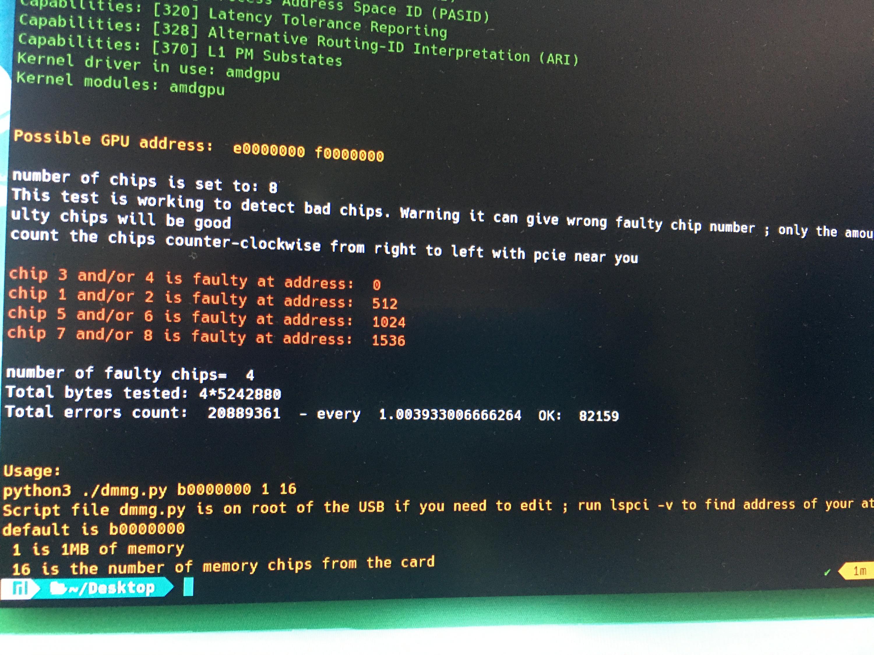 Hi guys i have an RX 580 4GB Gigabyte model card. That gives me black screen and 100% fan spin anytime i try to run Furmark or anything that put's it under load.I have run a Polaris Memory test using arch Linux and it generated the following errors. Can someone please interpret what it is actually saying and if all the memory banks might be bad ? It uses Samsung Memory btw.Really appreciate it thanks.