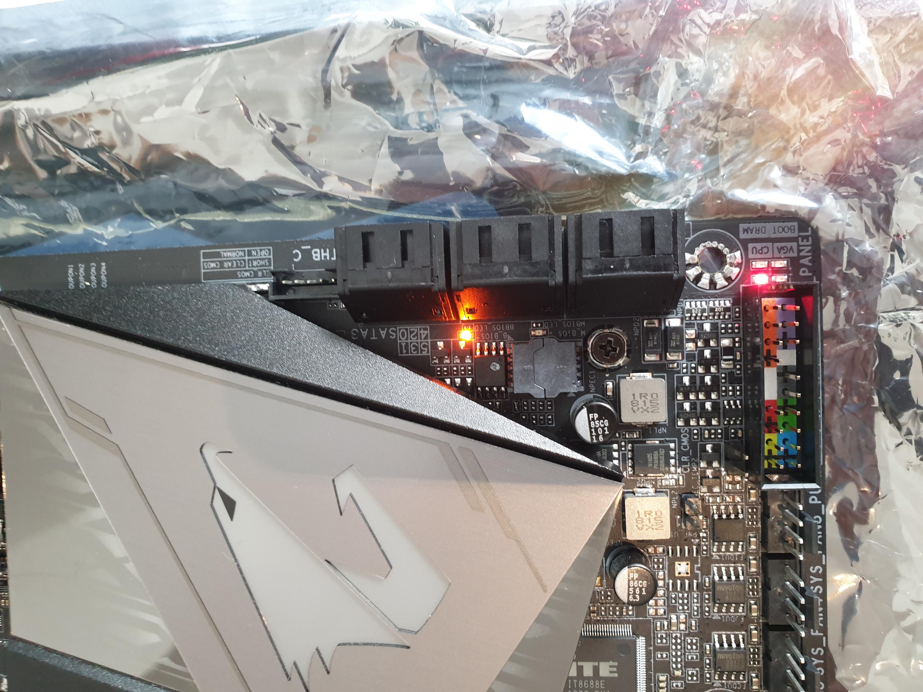The motherboard basically boots up and the CPU light doesn't go out, the CPU cooler spins without any problems and after a few seconds the board reboots into the second BIOS and tries to boot that way but no lights except the BIOS LED and the CPU light will light up.
