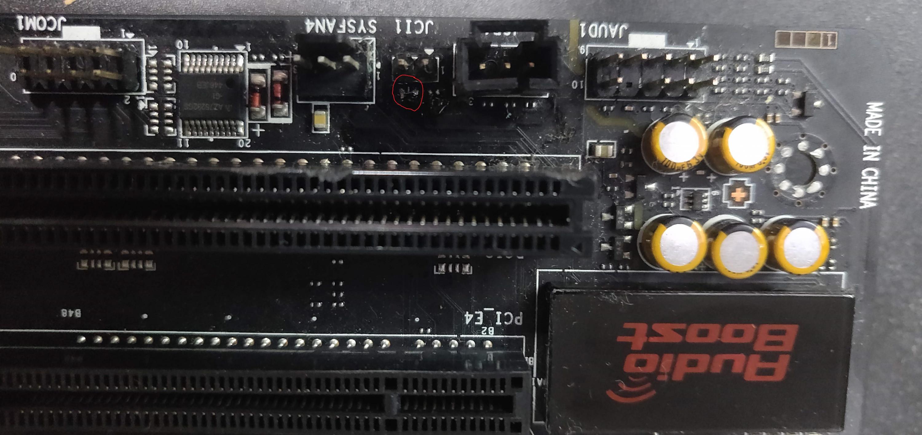 Found burned part above Chassis intrusion (JCI1)(right next to JSP1 and SysFan ports).