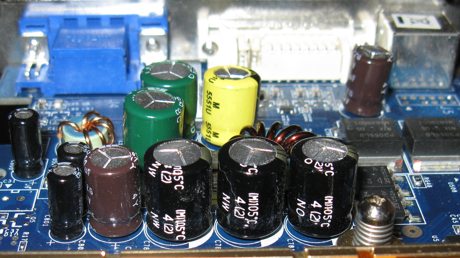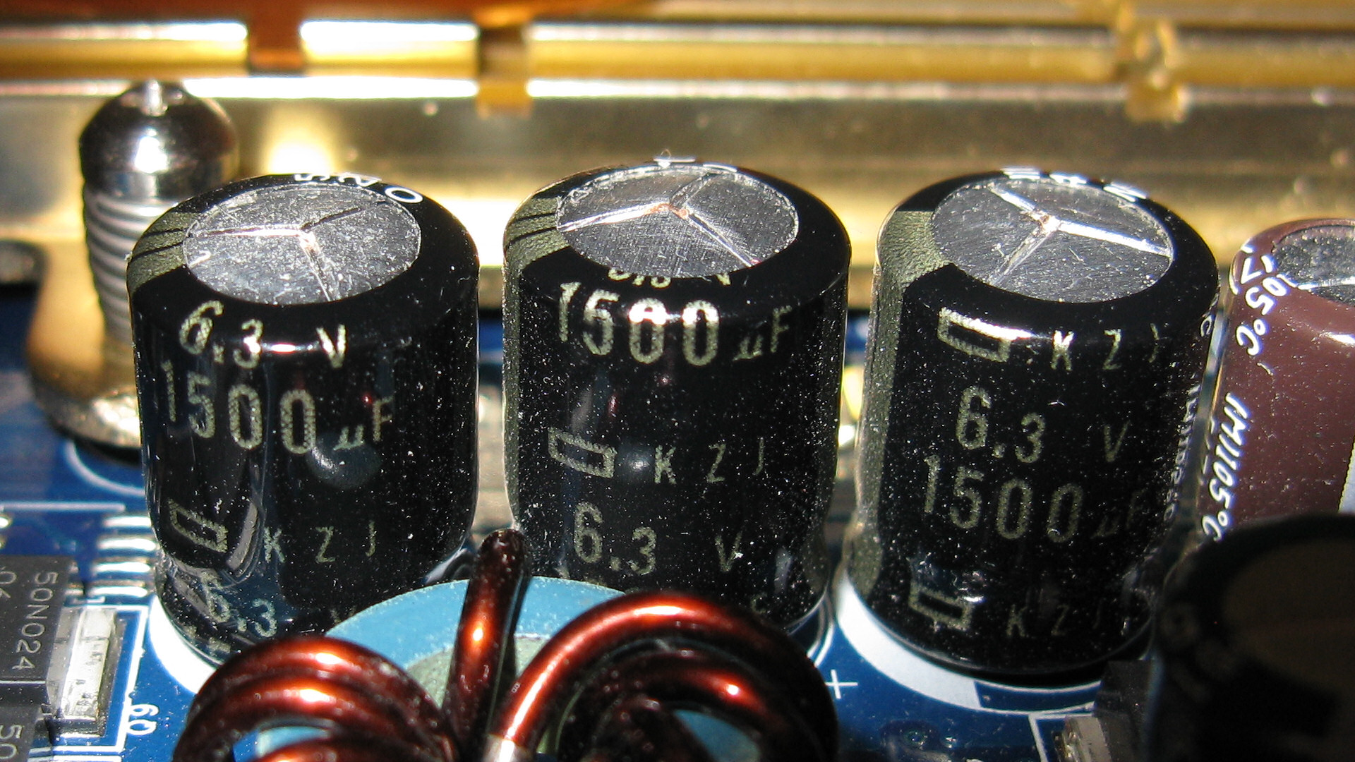Inspecting the video card shows 3 x 1500uF 6.3v KZJ caps are bulging and have a bit of ooze at the top.
