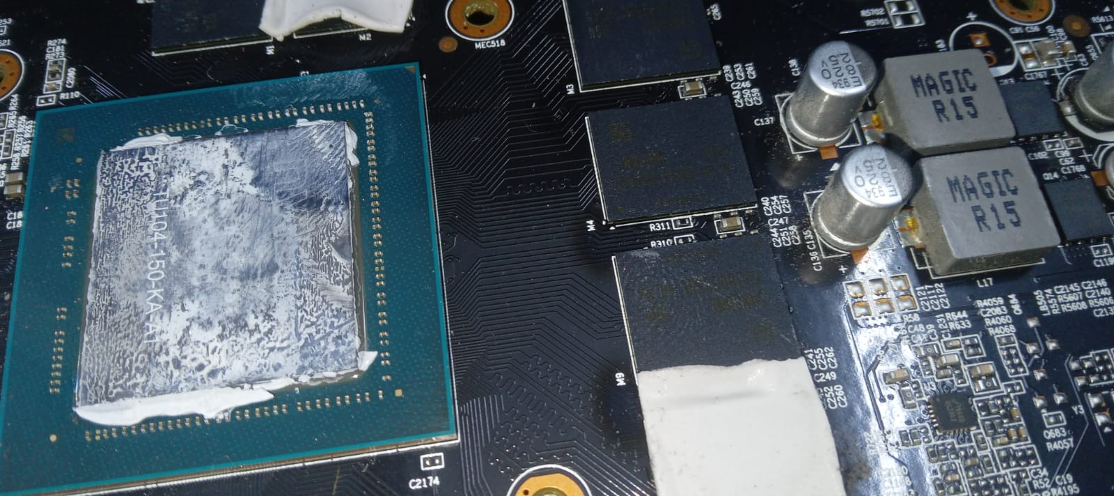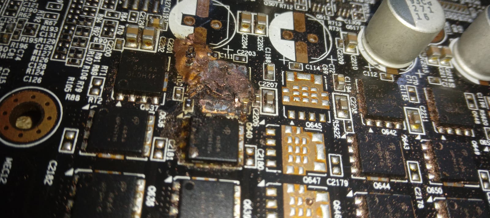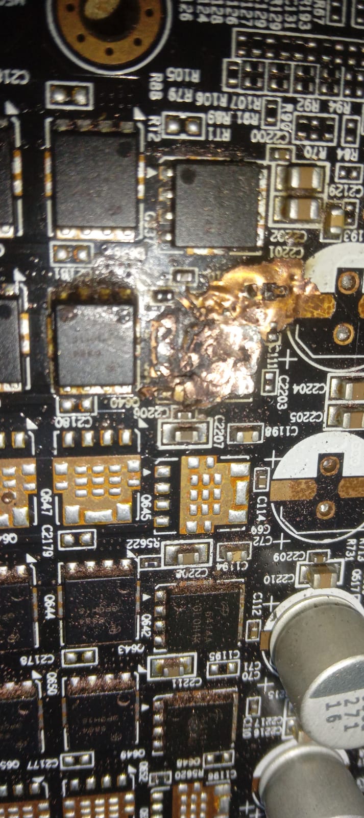 Is there a chance to restore the site where the mosfet was? I started to grind the mosfet substrate with a dremel, which stuck to the board, but for now I stopped and decided to ask you for advice. I also noticed dark spots on the PCB near the video memory chips. Does this mean that the video memory is out of order? I cleaned the place where there was a burnout, a short circuit of 12 V was removed. On the coils on the power supply of the chip 1 ohm, on the power supply of the memory 36 ohms. Are these resistances normal? I have not encountered video cards, so I ask you for help.