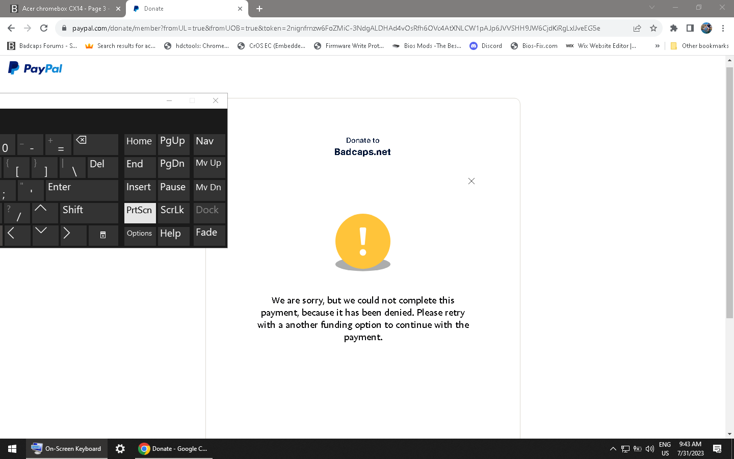 The Admin only accepts paypal donations at the moment. Try again later, if you ca`nt its no problem at least you tried.The Admin is always happy to receive a thank you message