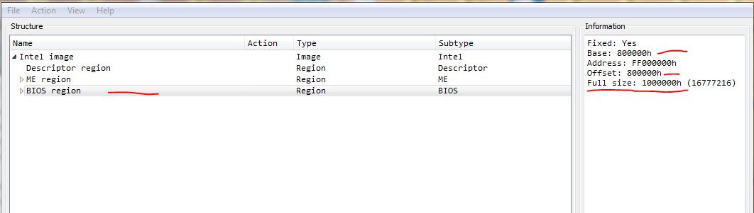 Close UEFITool and open it again, open the new rom. Look at the starting address for the bios region ,its 800000 (8MB) and the file length is 1000000 (16MB) ,the file needs splitting to 8MB + 16MB ,not the other way around.
