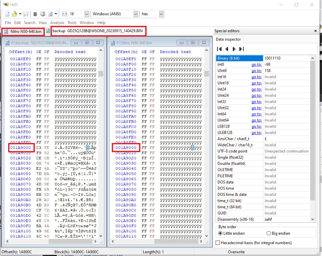 Sorry, what software are you using? I don't know why the two files are the same when compared using winhex? Maybe there is something wrong with my winhex file?Comment