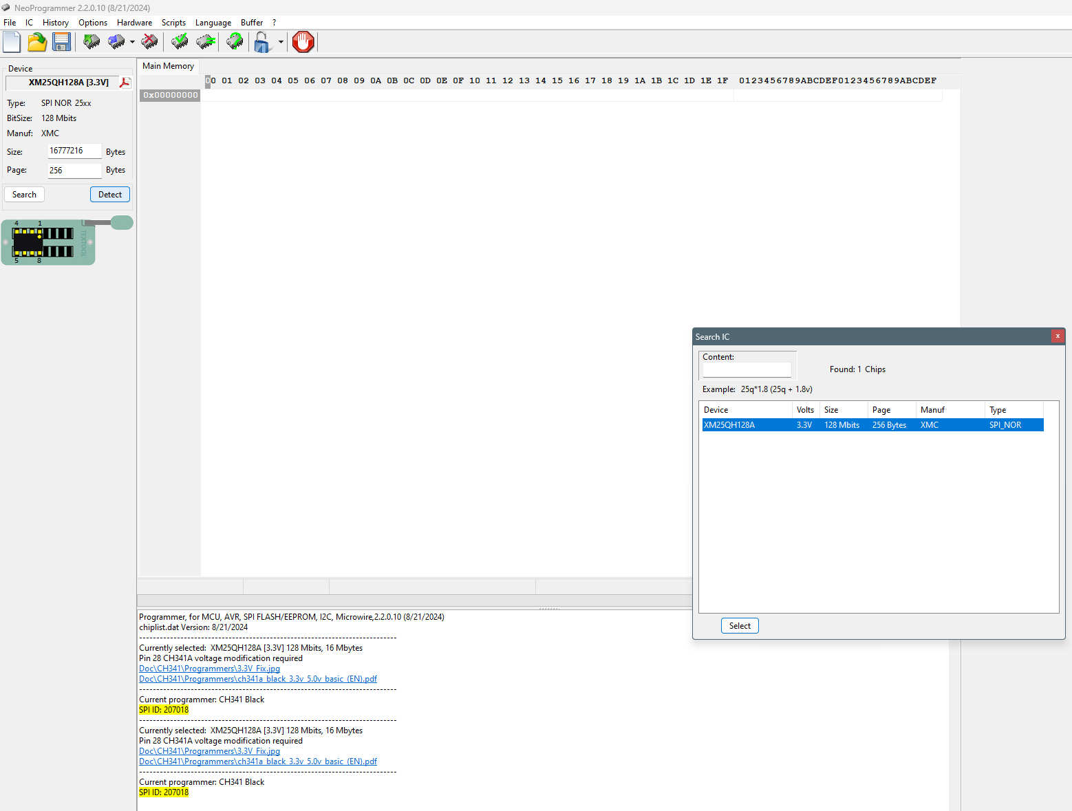 - Using NeoProgrammer 2.2.0.10 The device was automatically detected when Neoprammer was first opened. Search IC found 1 chip – Device: XM25QH128A. I then clicked READ IC which completed successfully. I then saved the .bin as XM25QH128A.bin.