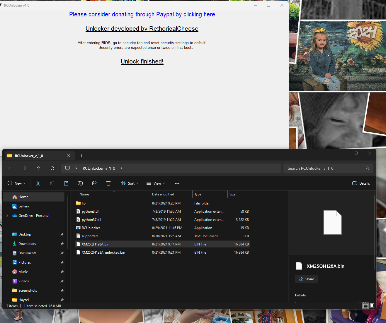 -I then dragged the XM25QH128A.bin on top of RCUnlocker v1.0 .exe. The opening screen displays “Unlock finished!” however underneath this text it does not display any system information which worries me something is not correct and thus the reason for this post.