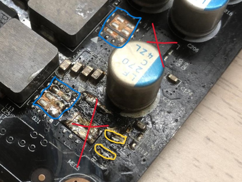 Are you sure that is a 970? Because it looks just like a 980Ti G1 Gaming. Anyhow, you need to bridge the yellow points, ideally with a fuse (not with 0 ohm resistors like I did). I would suggest to leave the red pads unpopulated and use the blue ones instead, replacing the stock Mosfets with sinopower's SM7320, they handle more current with less Rds(on) and the stock drivers are capable of driving them.