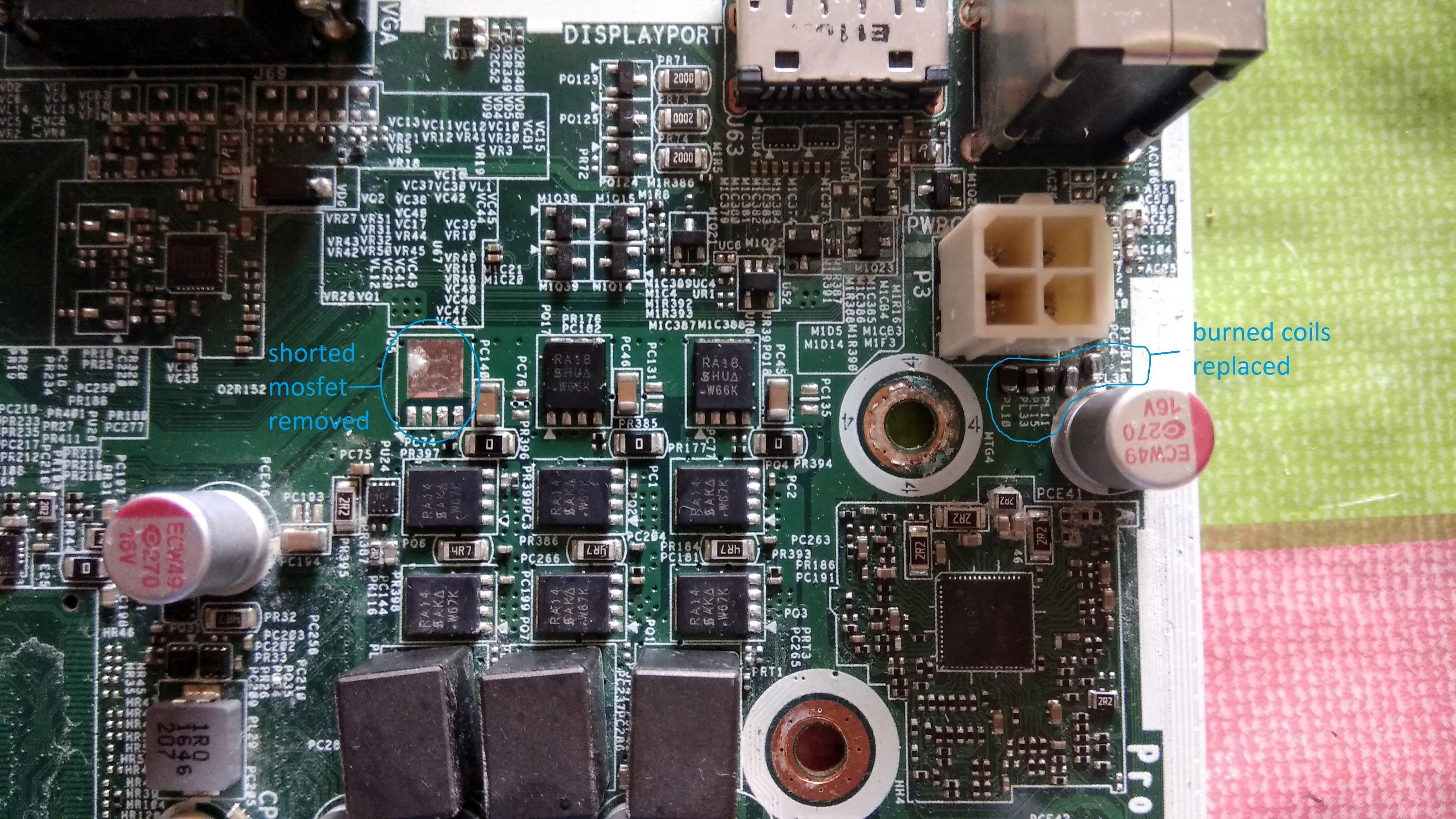 Hi, a shorted mosfet((spare is on the way) and 5 smd inductors after the cpu 12v. connector totally burned.