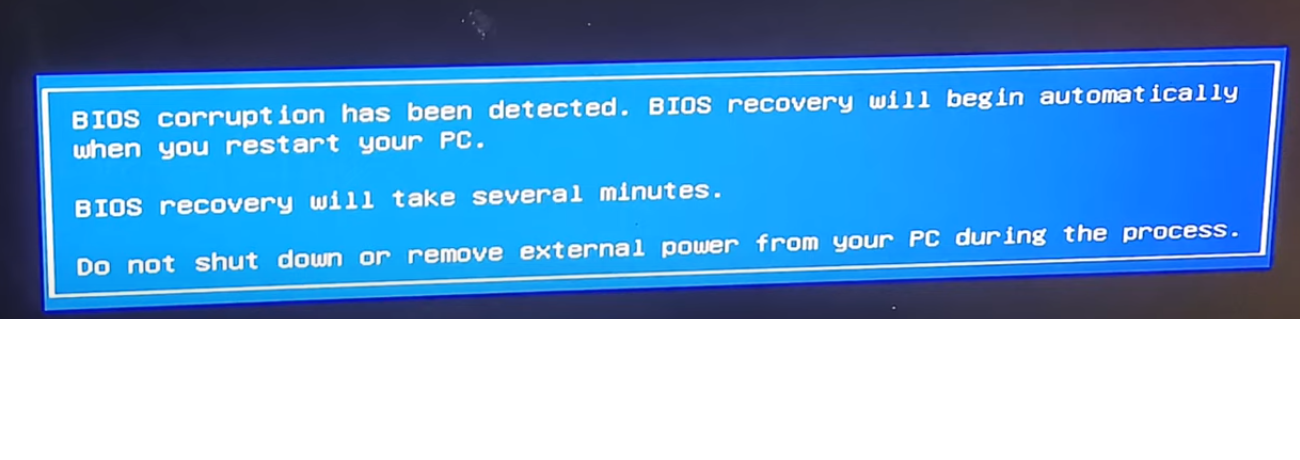 New HP desktops have a self repairing BIOS. It keeps 2 copies the Picture shows the HP initiating self repair which is copying the protected BIOS over to the operational BIOS. This process could take several hours and should not be interrupted.