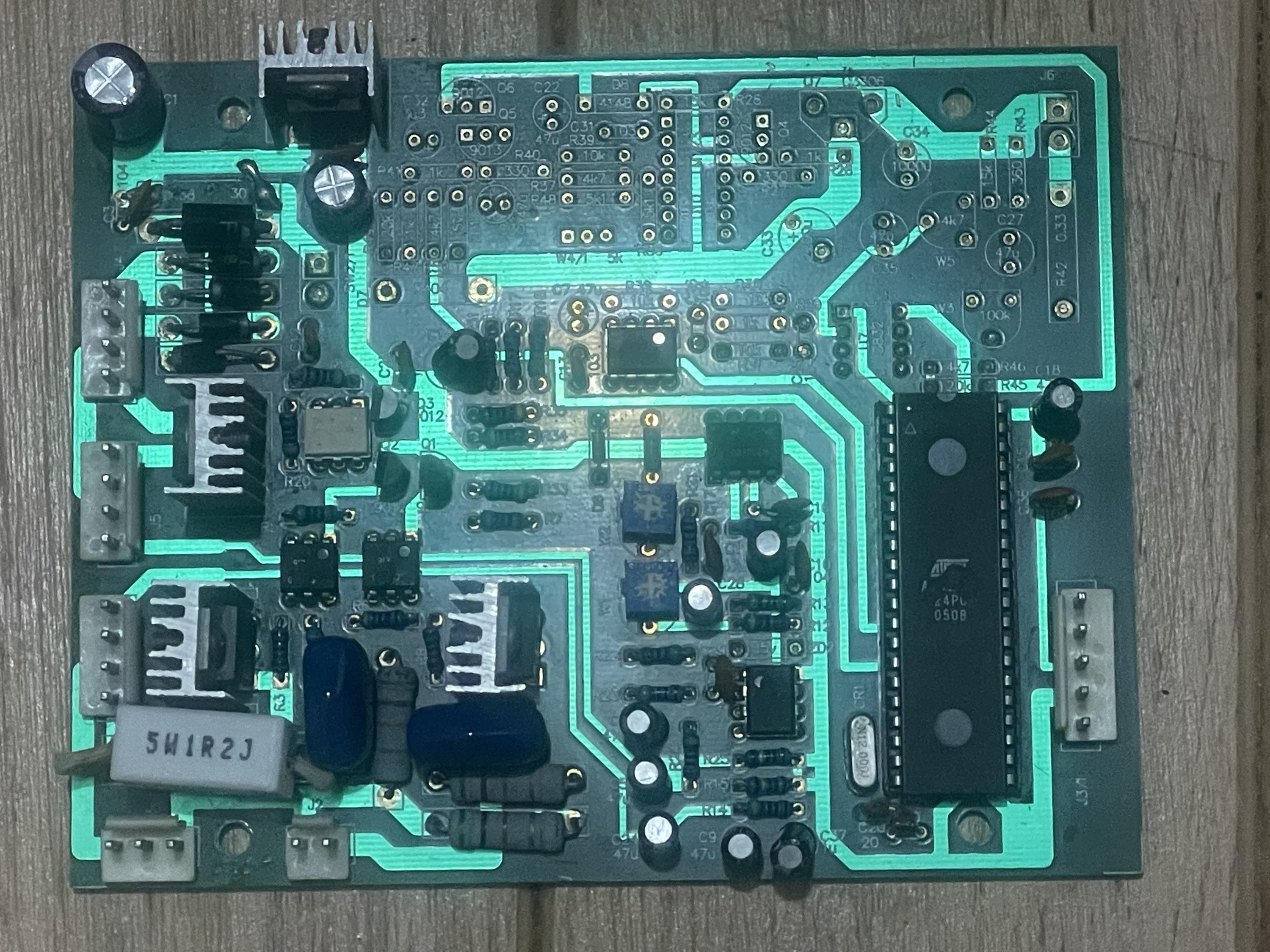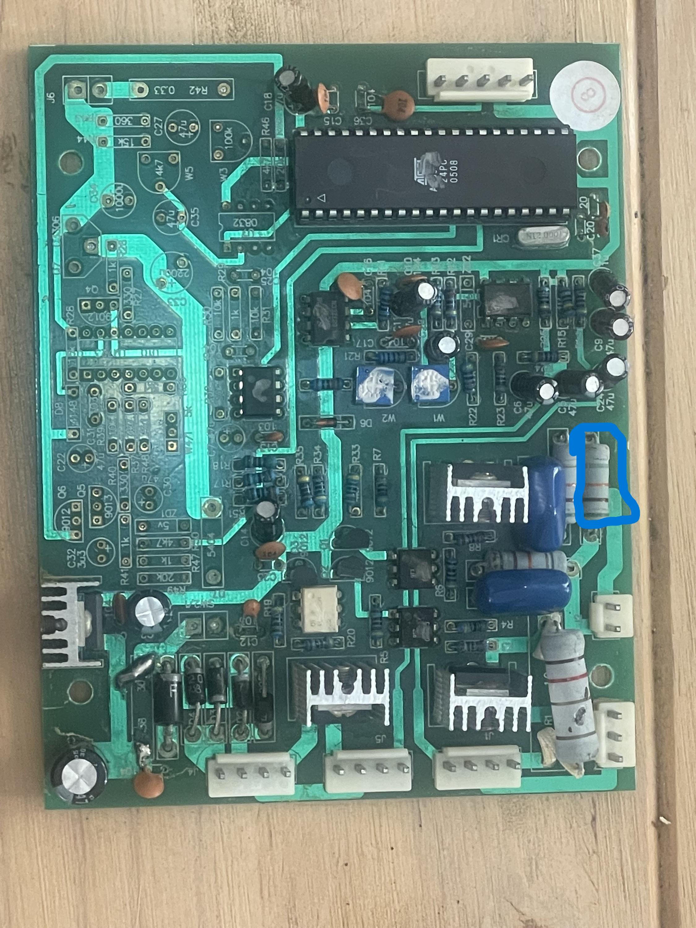 Two of the three are snubbers with the blue capacitors. The one at the top is in parallel with whatever goes to the two-pin header J2, maybe the air pump coil? I think it's normal to get hot if the air is on full blast or the coil is disconnected.