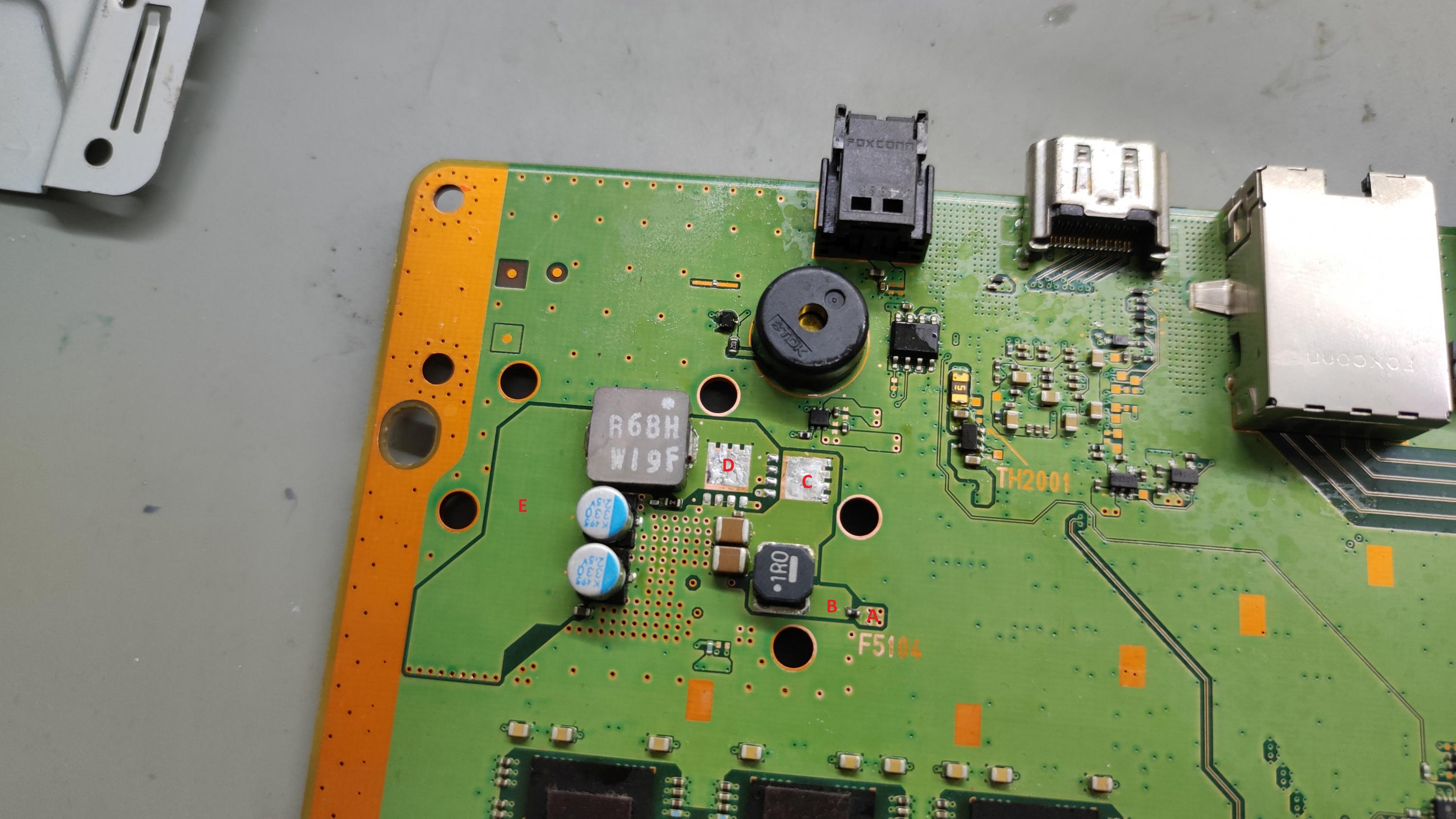 This PS4, after reassembly, just do a "beep" and immediately shutdown. After testing with another PSU we inspected the motherboard and found a blown fuse (F5104). Picture attached with some characters as traces notes.