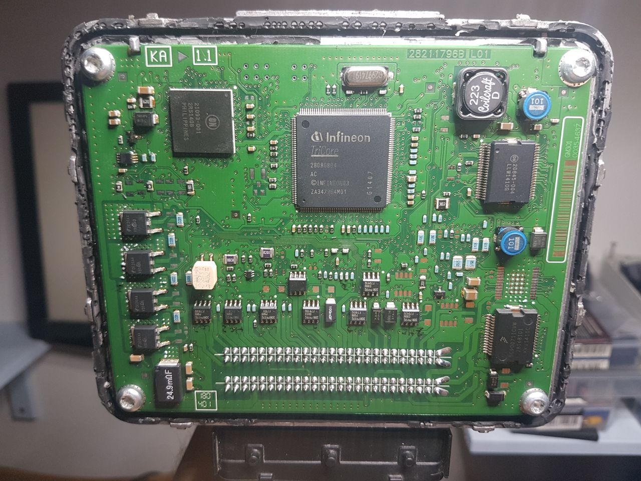 This is a continuation of the first post I made about this ECU. The ECU has no communication, dashboard fails to light up and so does the car. With all other devices unplugged and the ECU on my bench I powered it and scoped on both the CPU pins and the 2 pin crystal resonator. With respect to signal GND I saw absolutely no activity on both legs of the resonator, and for the cpu no oscillation seems to be happening, pins are either stuck at 3v3 or GND. The CPU still gets lukewarm im not sure if that's normal given the missing clock. Power rails seem to be present from what I saw (12v, 5v, 3v3, 1.2v) so I don't think that's causing the no oscillation. Possible to suspect the resonator itself? I don't believe they die often? If so I would need help sourcing some information about it as the only markings it has are on the top metal casing reading (D2997419I) which I can't find online
