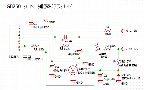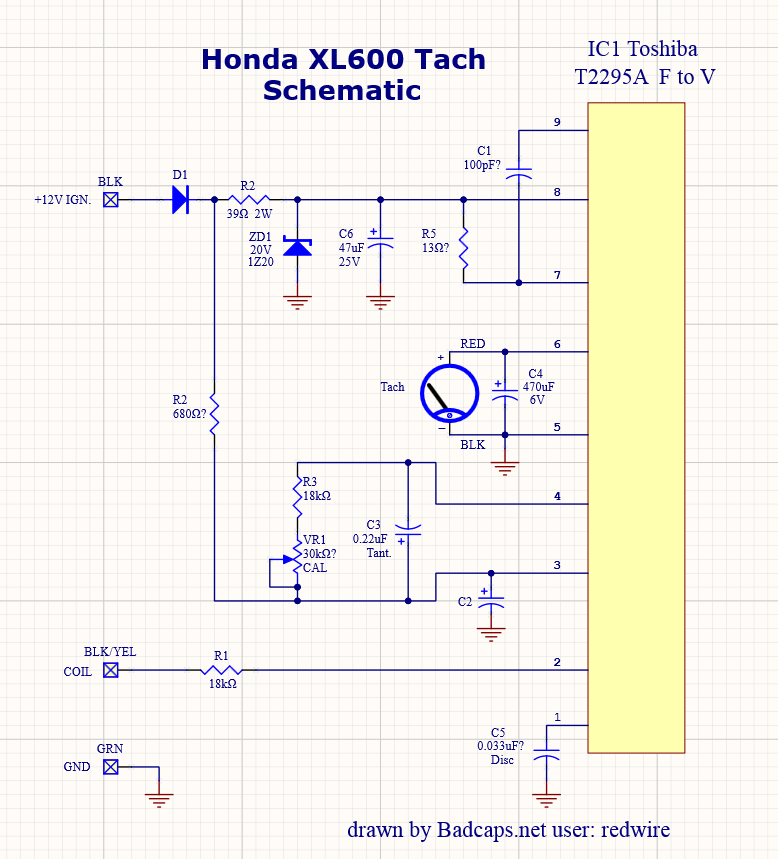 Toshiba T2295A IC is used in several tachometers for frequency to voltage converter. So the circuit can be figured out. Schematic is from a GB250? I could not find the IC datasheet.