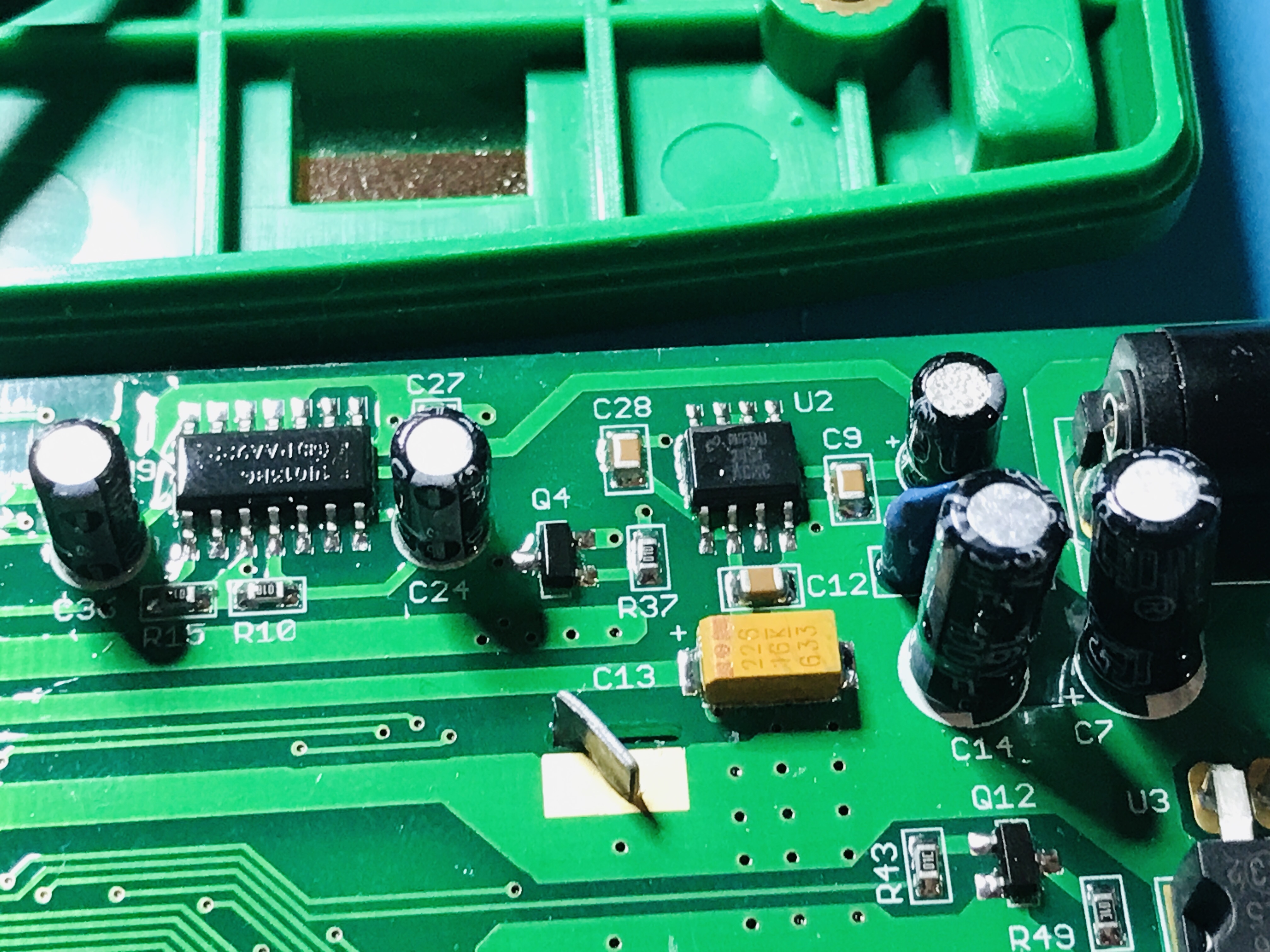 With my el-cheapo multimeter on diode mode (I think this is what I read as a very basic means of testing a transistor) I tested the collector and emitter sides of Q12 (it has "CR" on it). The readings I got mean nothing to me but to those in the know, it may; one side, I assume the collector, I got a reading of 1577 and then lost the reading altogether. Tested several times and the same thing happened. Other side if Q12, I get a steady eading of 698. Thinking the disappearing reading on Q12 odd, I found that Q10 also appears to be "CR" transistor so, I tested it also. Got steady readings of 1568 and 690. Does this meant that potentially, Q12 is cactus?