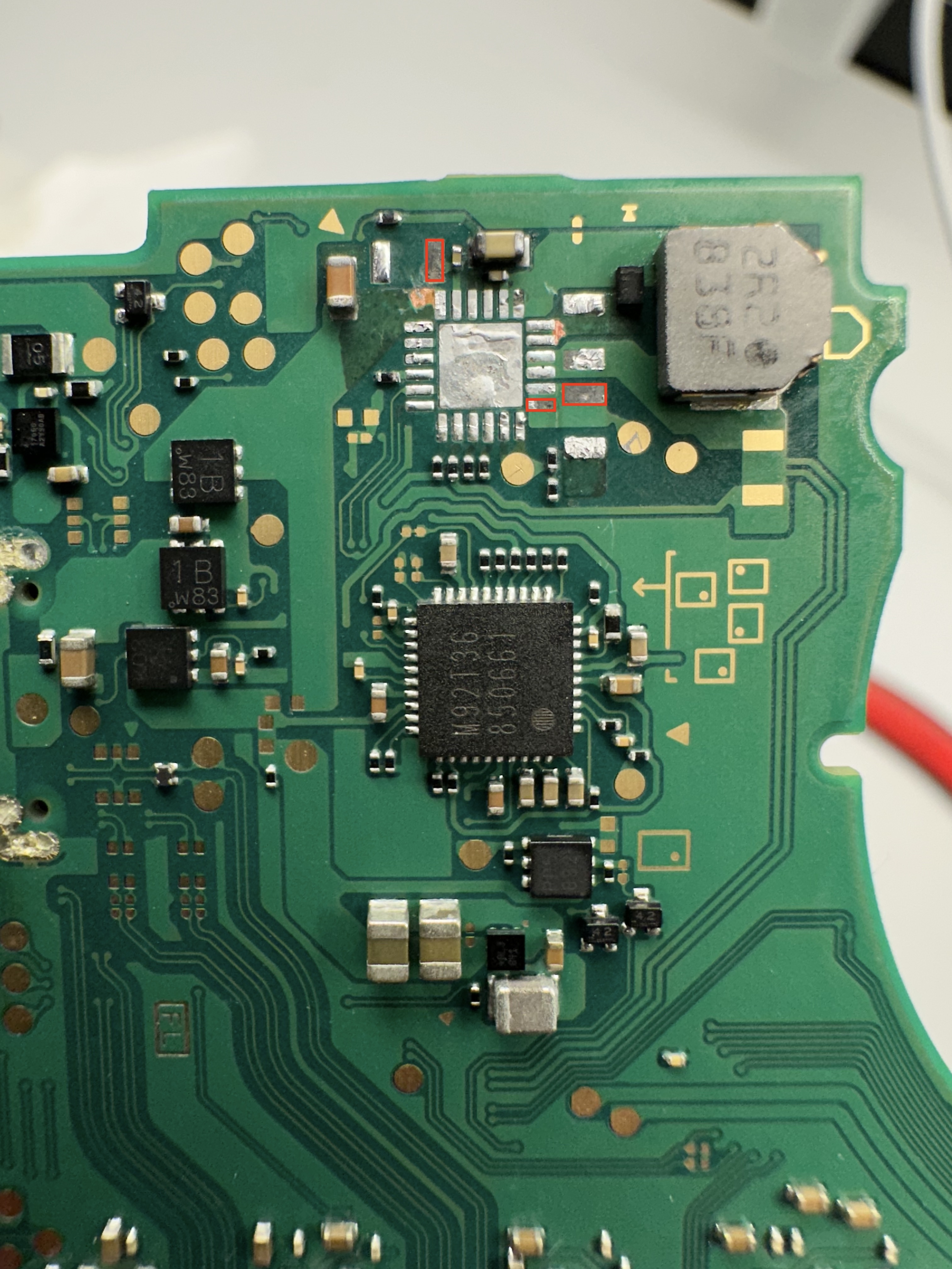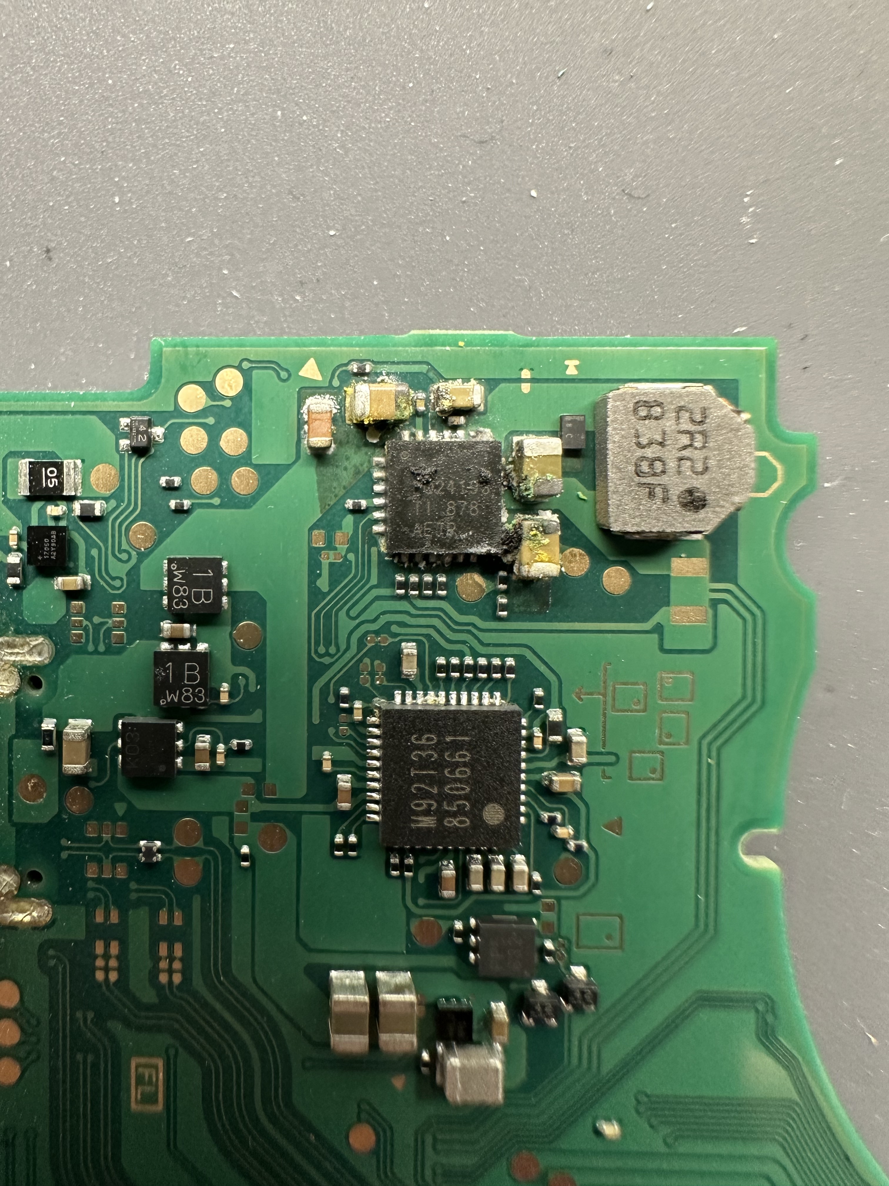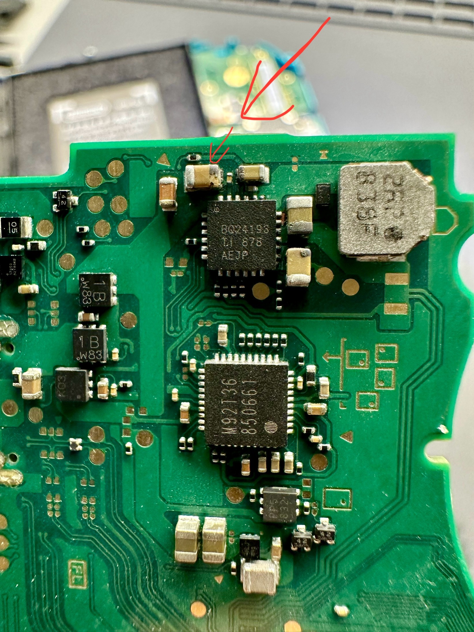 Hello all, I'm diagnosing a Switch Lite for my friend and found liquid damage that corroded the capacitors around the BQ24193 chip. I'm not 100% sure if the chip is actually bad yet, but I did find a shorted capacitor (image with red arrow). The short is still present with the BQ24193 chip removed and I unfortunately also found that the corrosion took the lives of a few capacitor pads as well as half of one of the chip's.