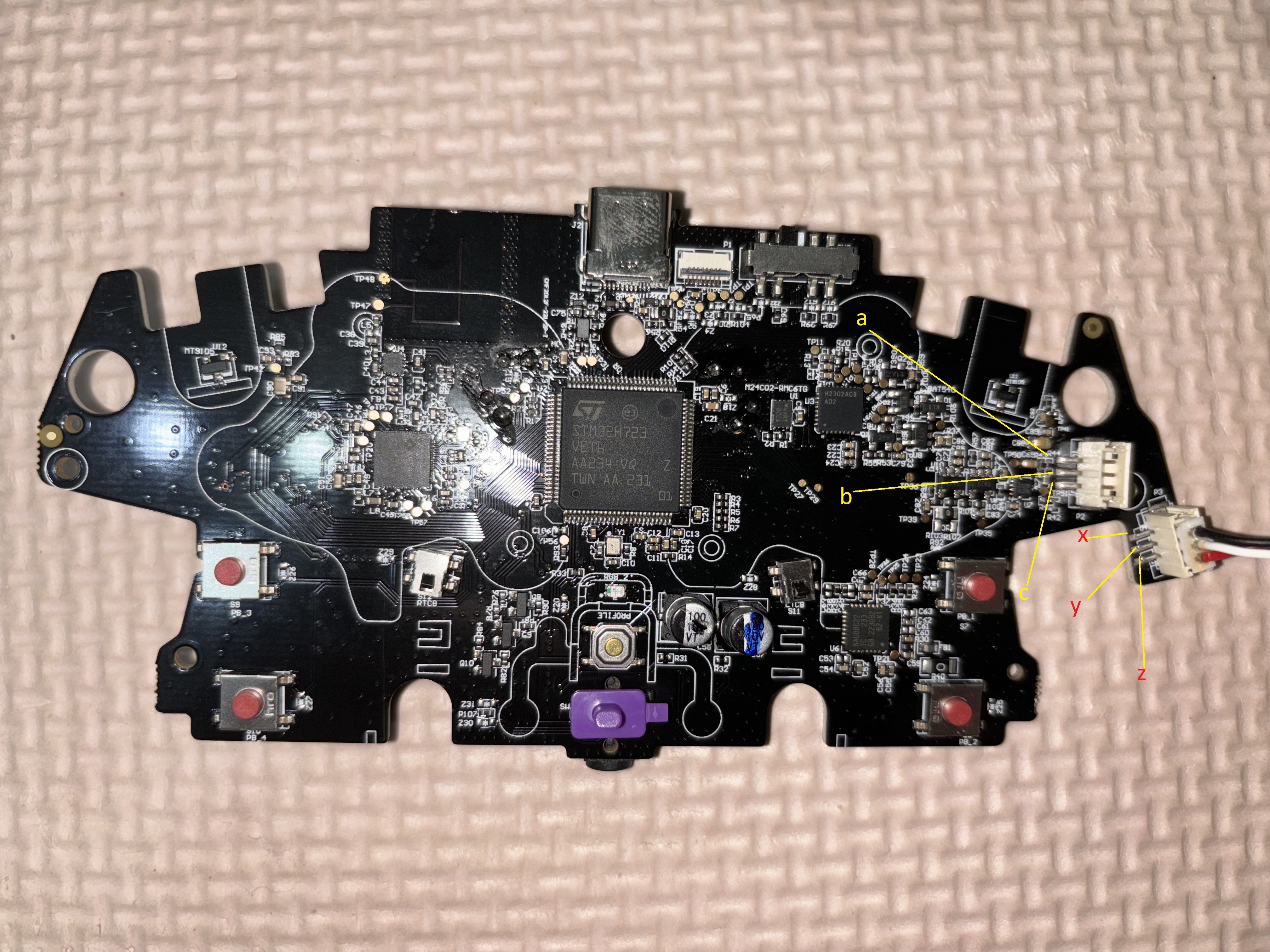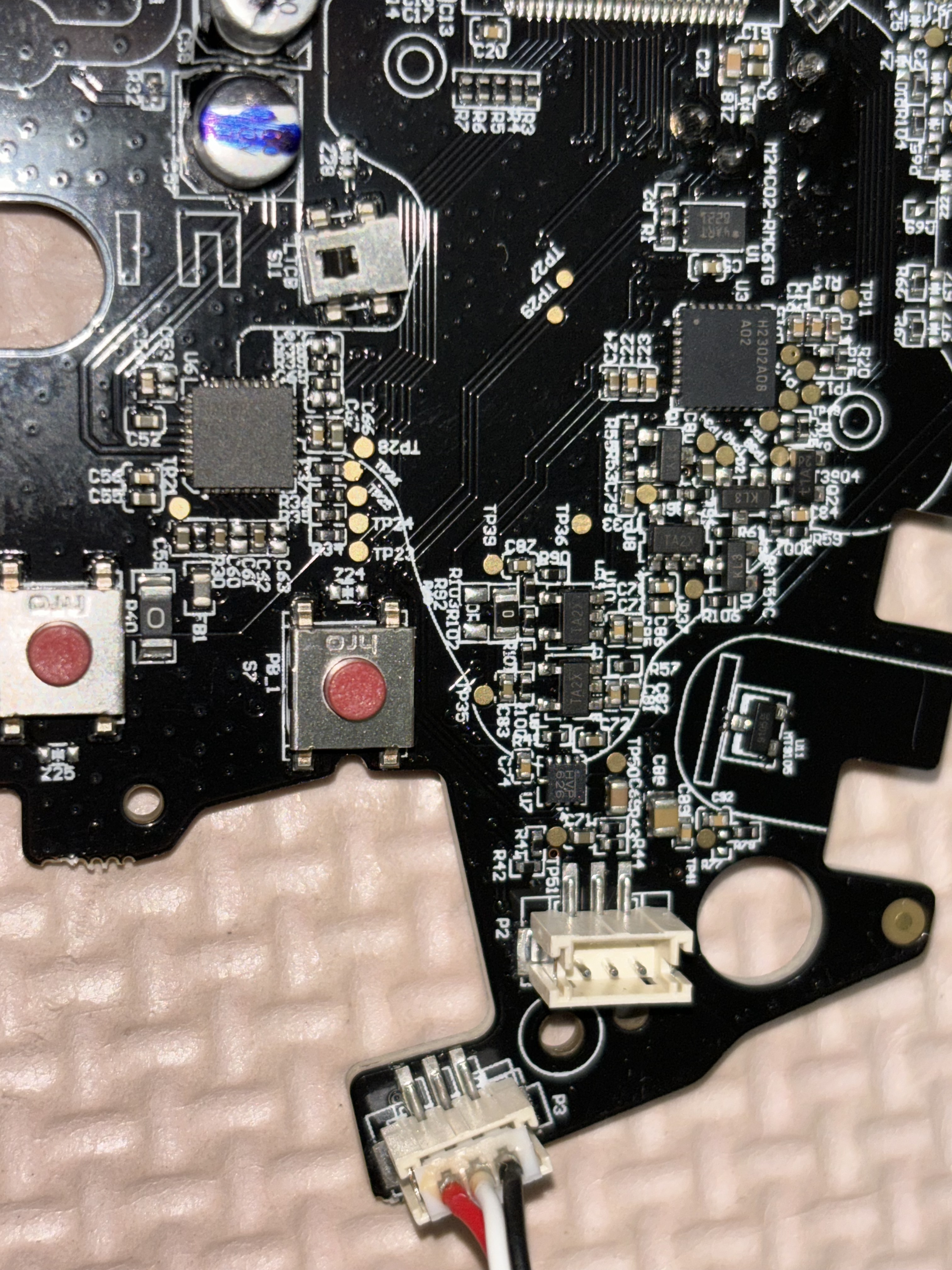 So, here is a controller which has 2 batteries, their connectors on the right side. The controller does not work wirelessly and if I try to switch on it lights in red until i release the button. Furtheremore, I beleive that it never ever worked wirelessly. The voltage on the batteries (between a-c and x-z) are 3.8 volts and if I connect it to a charger it flashes one green.