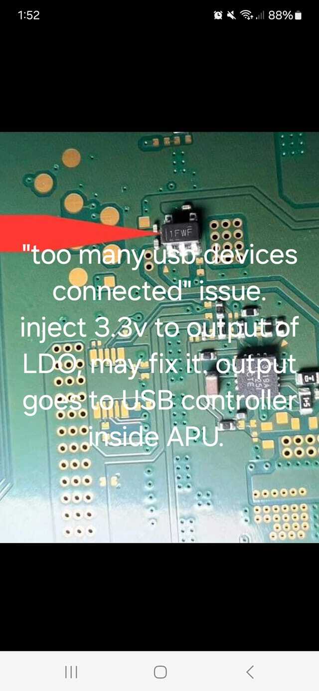 Hello. I have a problem with a PS5 console that I bought to learn electronics repair. The auction description indicated that the console had been dropped. The HDMI port and USB ports were damaged. The HDMI port was replaced by the previous owner, and after his repair, the console worked for 2 days and then became dead. After receiving the console, I replaced all the USB ports. After replacing them, the console started to turn on. On the logo screen, it displays "too many USB devices connected". My further attempts to fix the error involved replacing the Southbridge, 4 TPS2001D chips, and the Wi-Fi module. Unfortunately, the "too many USB devices connected" message still appears, which means I can't synchronize the controller to start the console. I would be very grateful if you could point me in the direction of where the problem might lie.