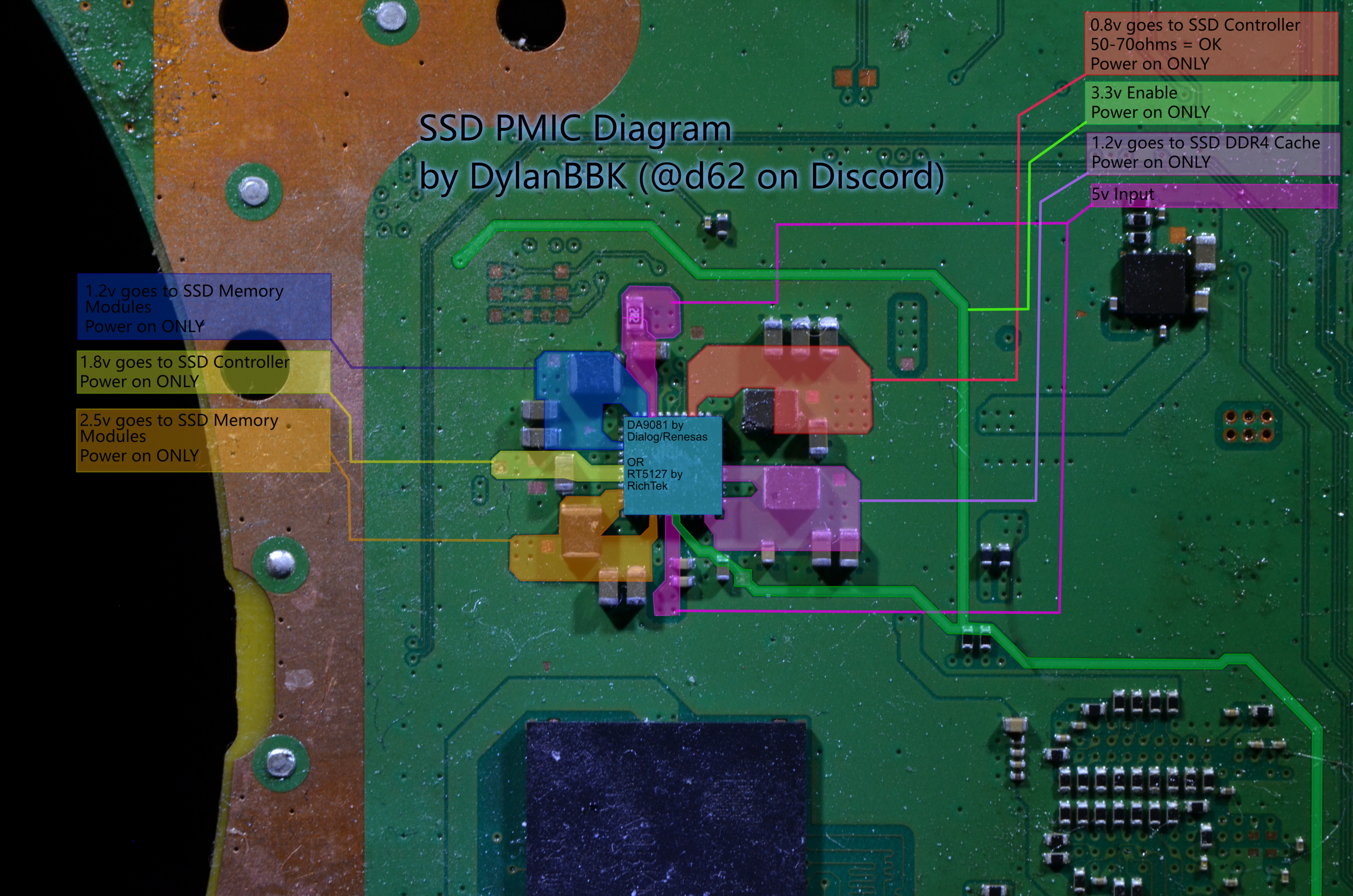 hello. i've a ps5 edm-033 mobo w/ no power, lights, but one beep when power pressed. i've hooked to uArt and only error code is 80871001 (DDR4 No Power or Short Circuit). i have a donor board, same model, that does power up, fan spins, blue light, and beeps 3 times, then powers off. it has a botched HDMI port replacement job. so w/ the board i'm interested in, with the error 80871001, i was able to research and obtain voltages of the SSD PMIC. i've attached pictures of the provided diagram by DylanBBK (@d62 on Discord) and my voltages and picture of my board. my question is on my picture highlighted with the white line is the only 3 points that show no voltage going to SSD Memory, wich should be 1.2v --- theoretically, if I were to replace the no voltage points caps with new ones, should it resolve the error of DDR4 No Power or Short Circuit? i'd like to limit my de-soldering and re-soldering of such small components and risk damaging the mobo for an attempt that wouldn't make a difference either way. btw, no shorts on power rails or any other soldering was down on the board, other than simple uArt connecting. any help would be appreciated. thanks. ps...ive also uploaded screenshots of my uArt connection(s).