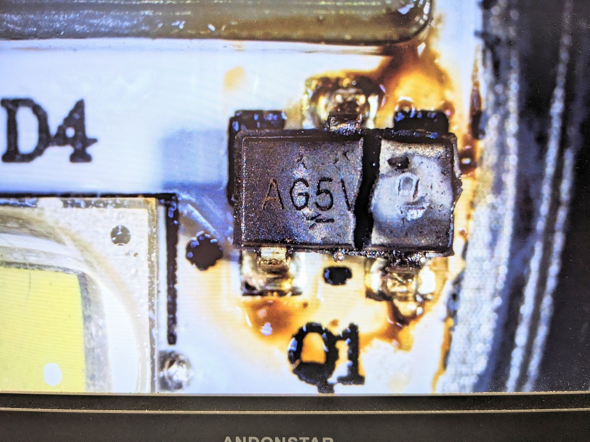 Hi, my neighbor gave me a faulty bike headlamp (Magicshine MJ-906B) and asked if I could have a look at it. I opened it up and saw a blown-up component, likely some kind of transistor. The writing on the component looks like "AG5V" but I can´t seem to find any information on this component. Does anyone know what it could be? Also it seems that someone else had worked on the device before (the battery wire soldering looks bad) but since it worked until recently that´s probably unrelated... Any help would be appreciated.