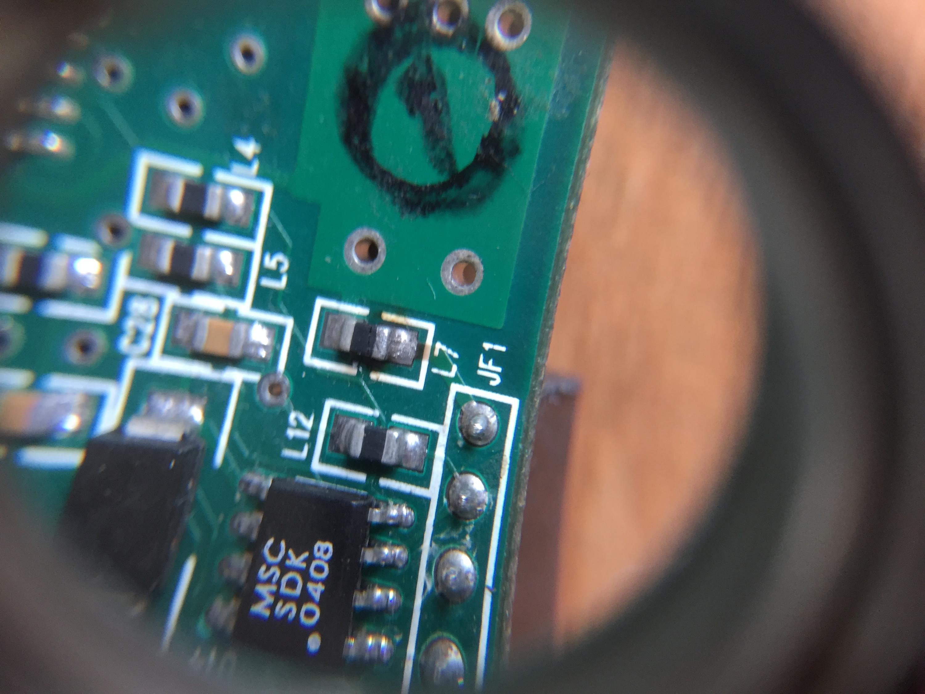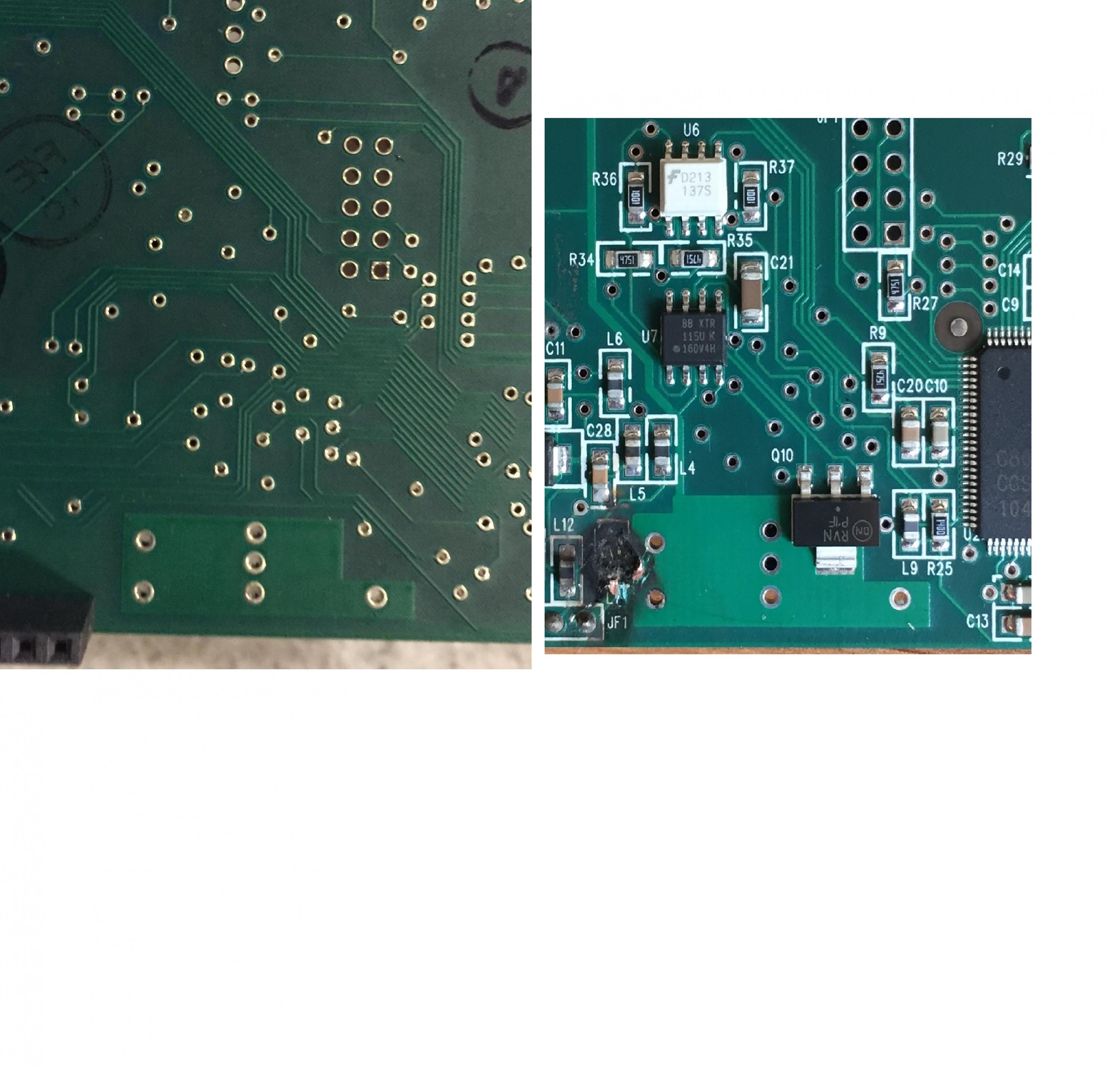 I unknowingly plugged a display module that had a shorted diode into this board, the result was a puff of smoke and the crater by the ground plane seen in the picture below. Having another board with the same issue, I began to test and remove components one by one with the hopes of figuring out what the shorted diode destroyed but haven't had any luck.