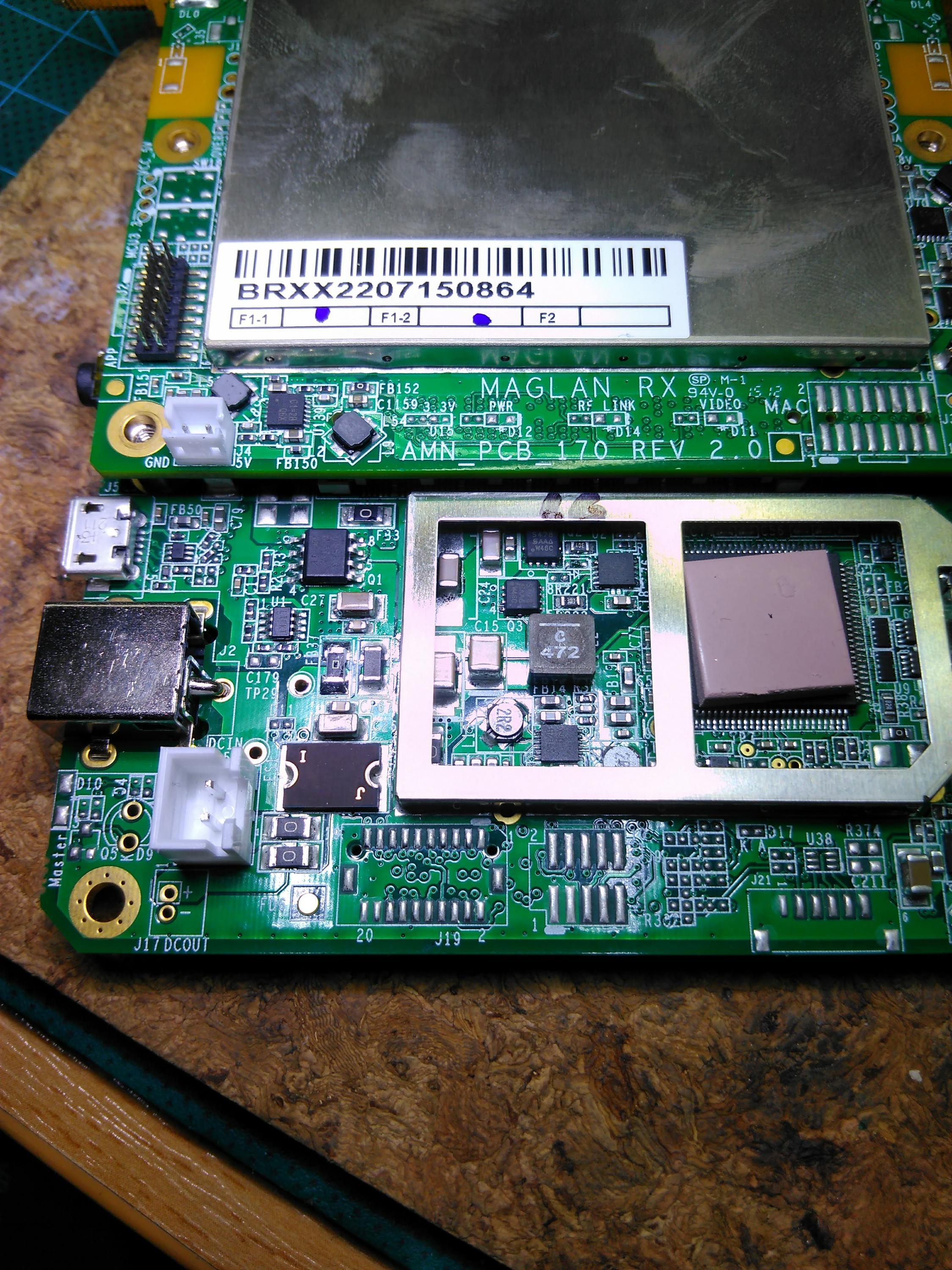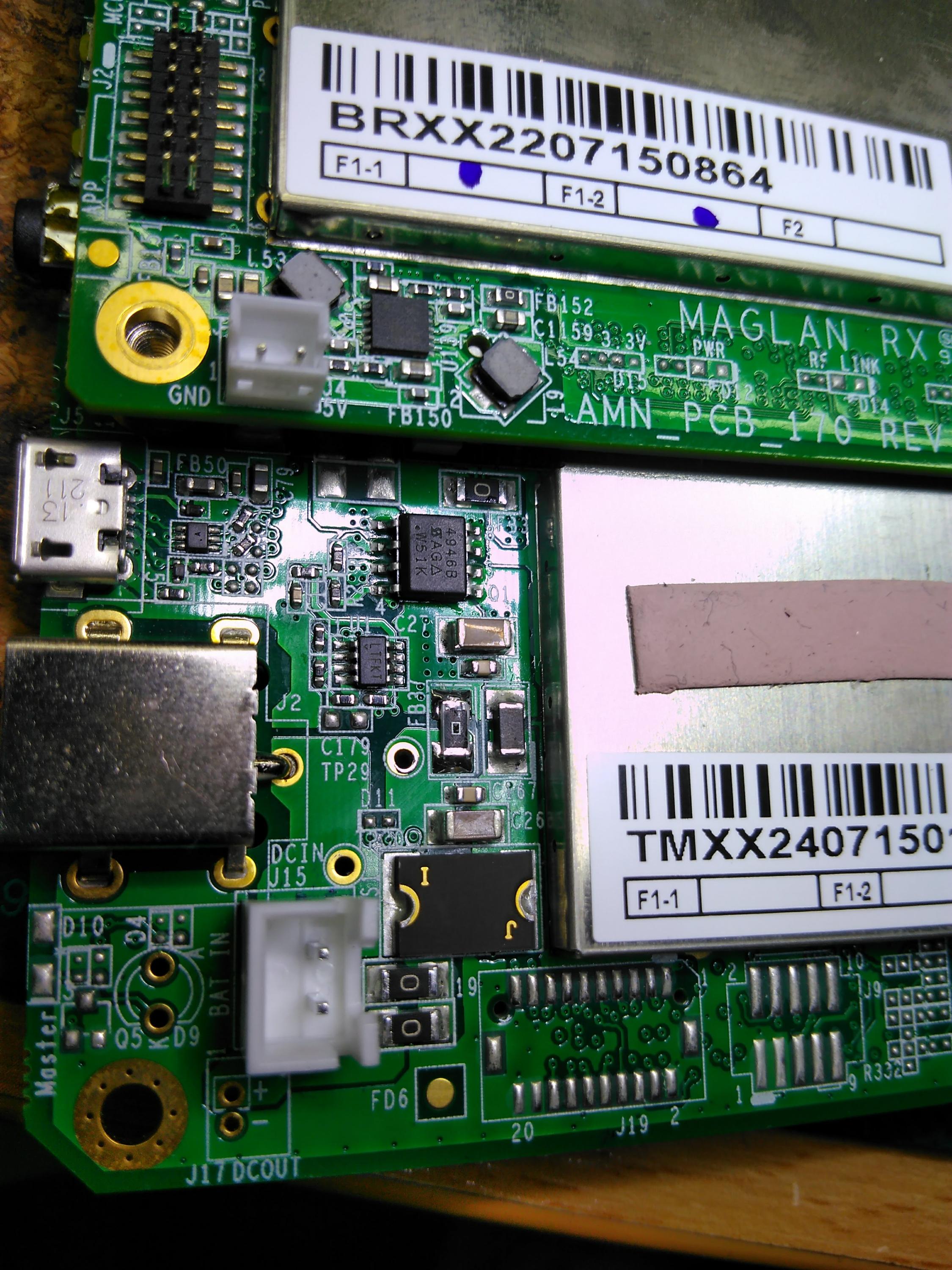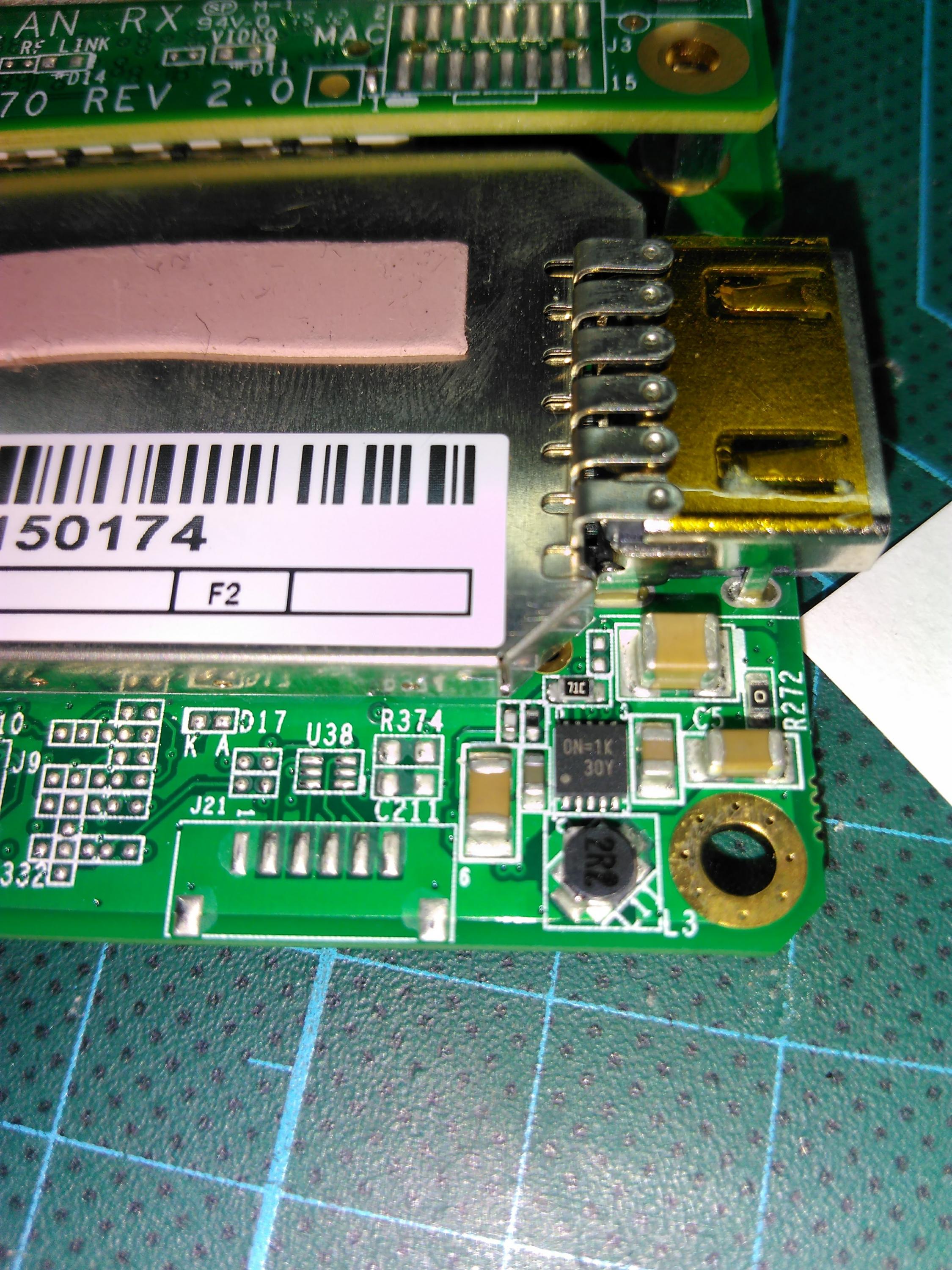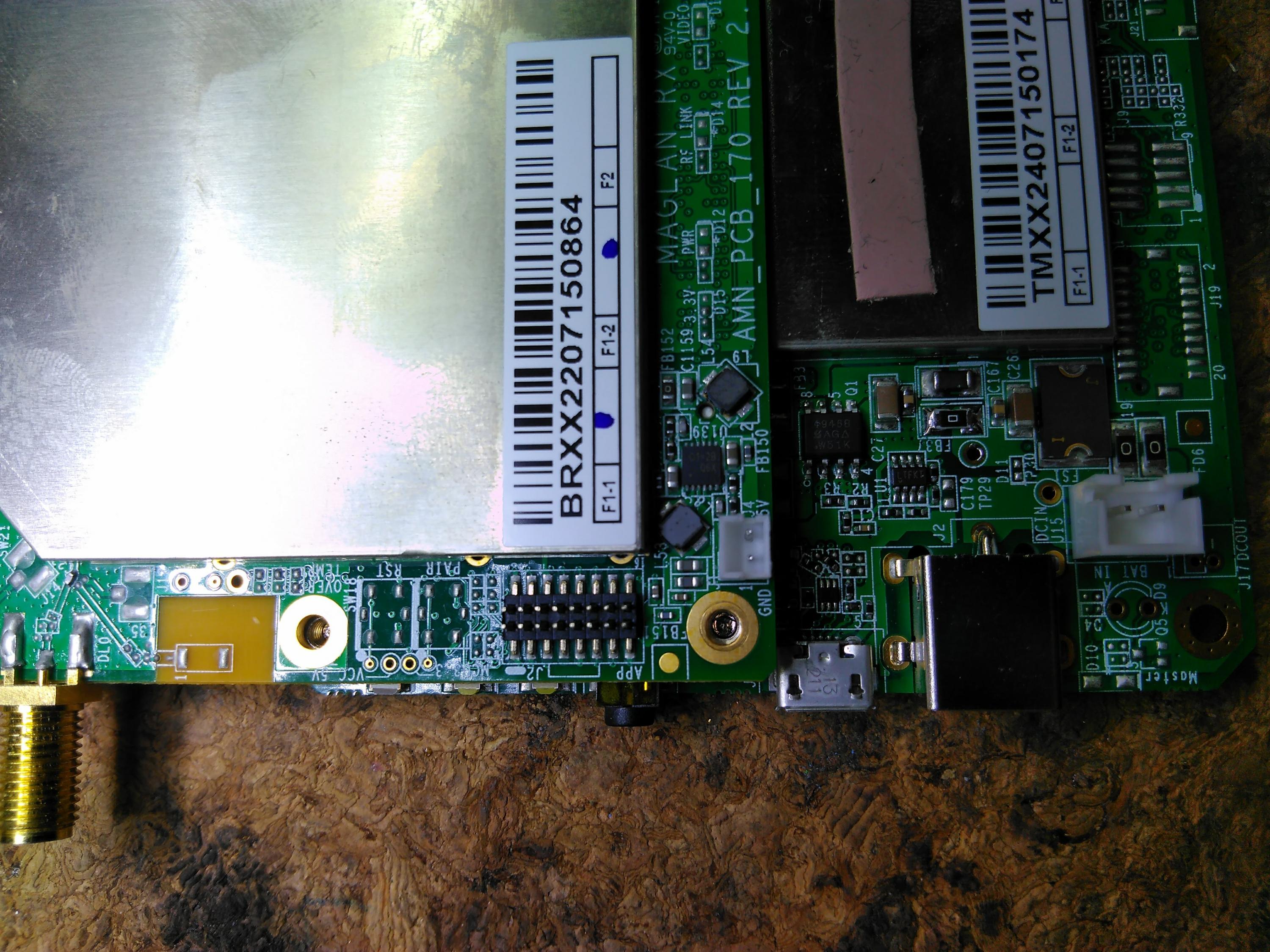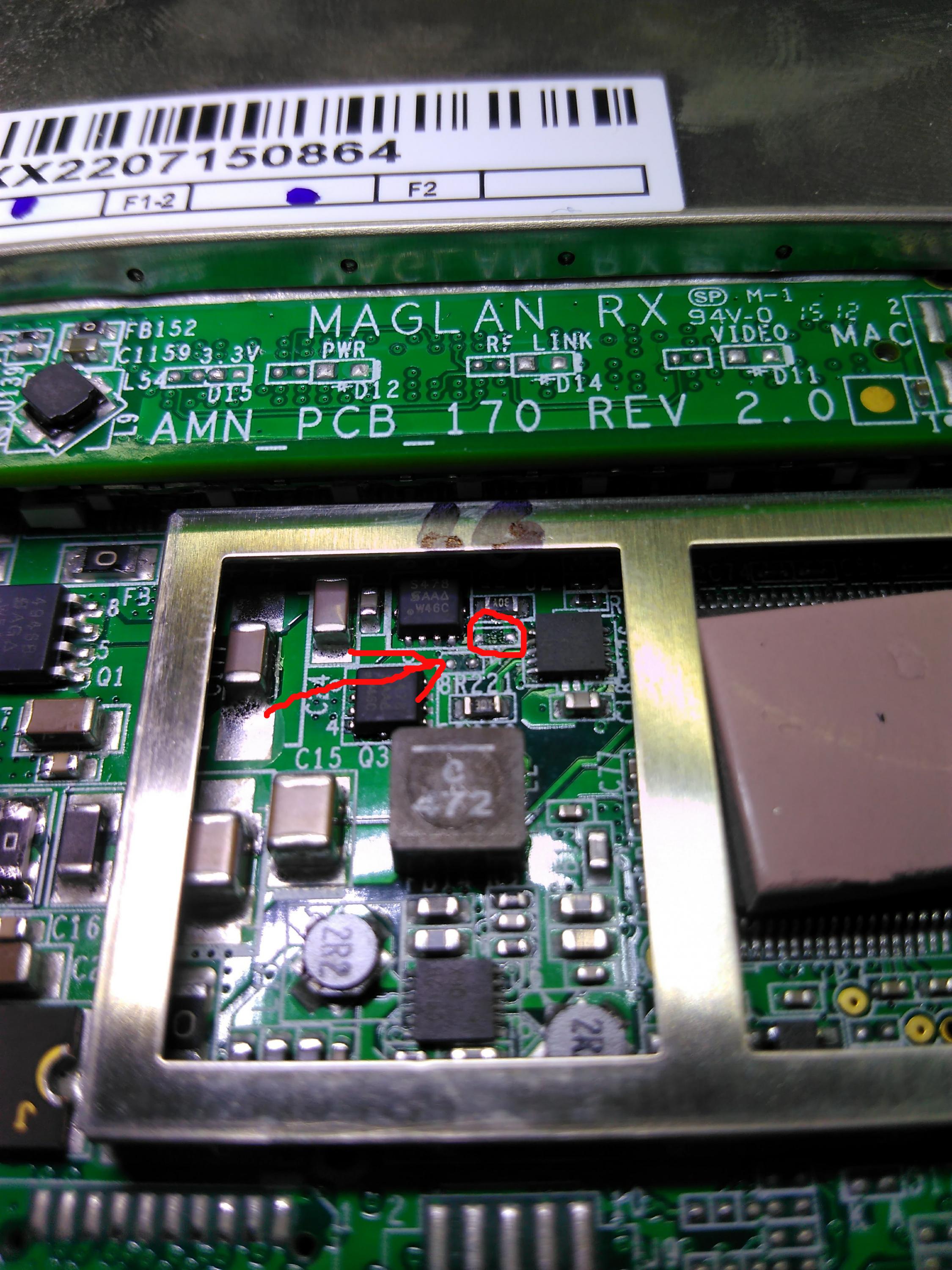 i have this device,it is actually fullHD video transmitting system with 1ms latency,specialy made for big drones. I have problem with receiver,first i replaced one 0ohm resistor-this resistor was blown(the same problem was on another unit before when someone plugged reversed polarity in),now if i plug power in and switch on,nothing happens,no LED light,nothing.it takes arround 250mA from power source,what is too low,correctly it should take arround 1A and more. I meassured some voltages,there are markings on the board and i fount that on 5V line is arround 4,4V only. I found also regulator which generate this voltage but cannot find type or datasheet for this chip and meassure more.