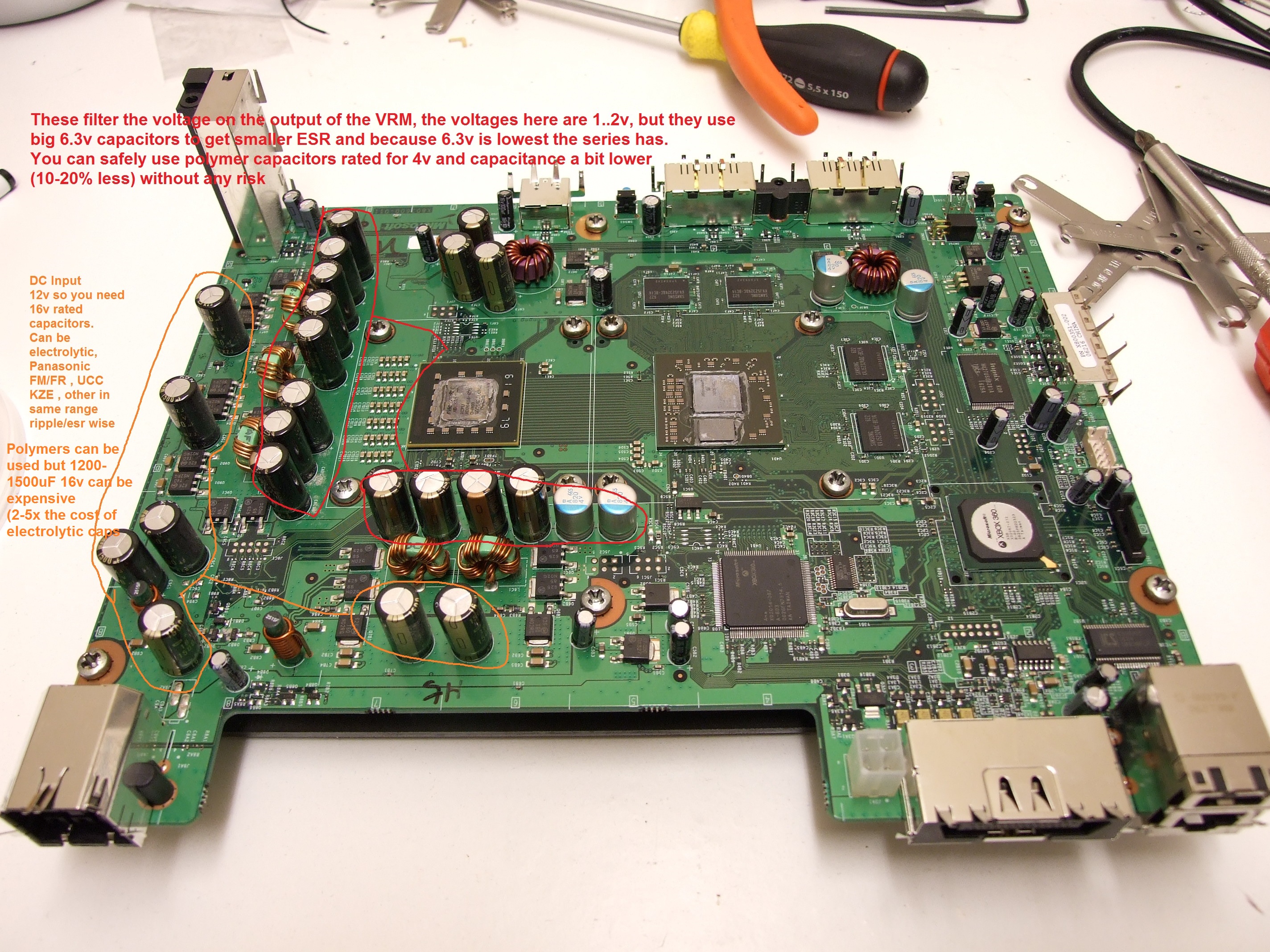 Hzs are rated for 2200uf 6.3V and they are vrm output caps I suppose, while kzjs are 1500uf 16v, probably input filter caps. I have a ton of ucc 820uf 2.5v polymers lying around. Can I use them instead? Also, this particular 360 is on 7357, so I might jtag it tooReplace with electrolytic capacitors that are very low ESR (Panasonic FM/FR , UCC KZE series) or polymer capacitors.