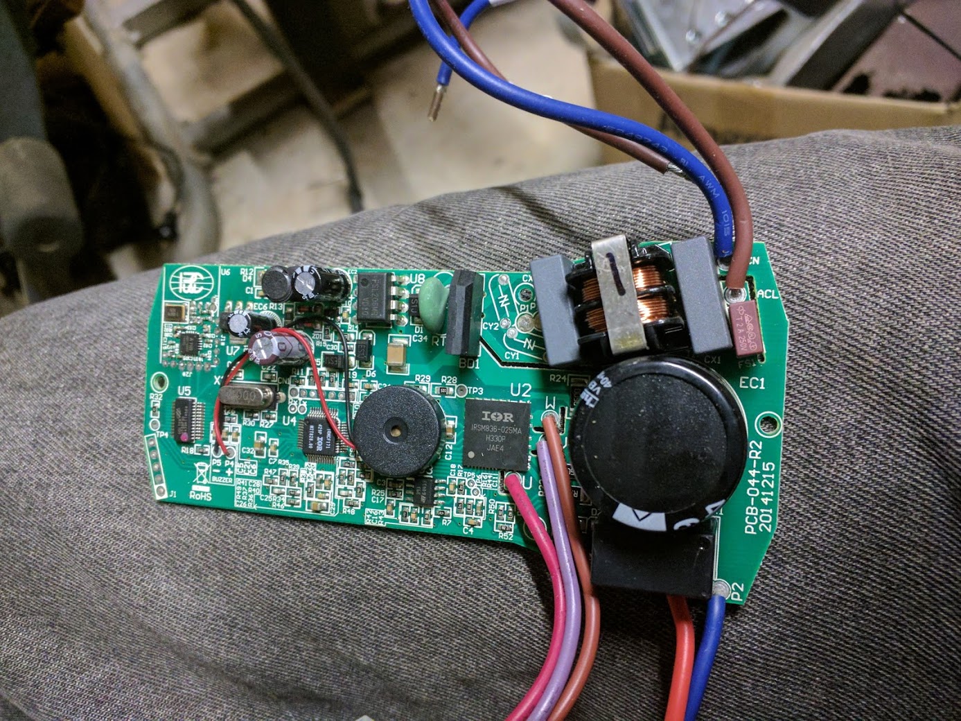 *The whole input bank (inductors(?)+film caps) in circuit from the AC input wires (brown/blue) to the bridge rectifier measures 164uf (vs 154uf on the good fan control )) - 8.4/7.4 esr respectively, so I'm not sure that even though the film caps are >10% outside spec that this would fix it, particularly as the bad one has a higher capacitance reading.
