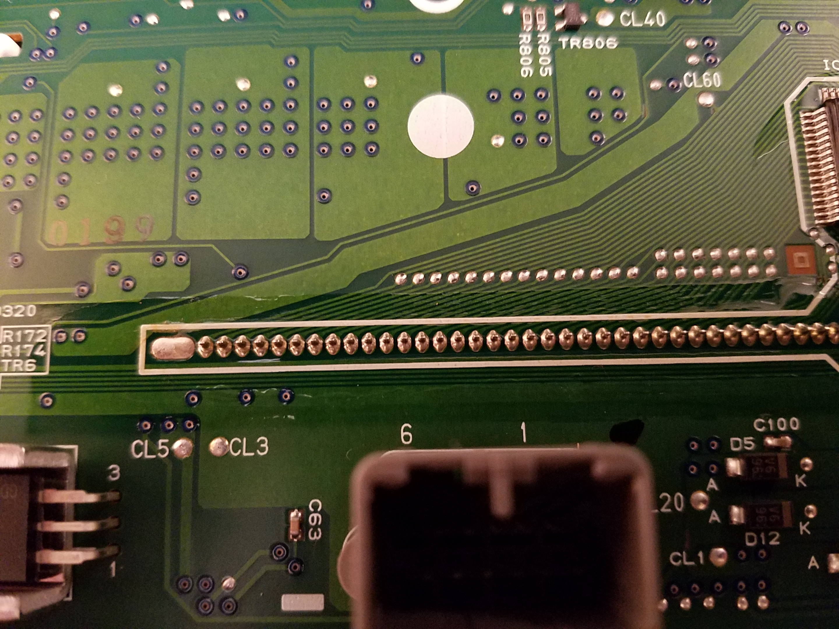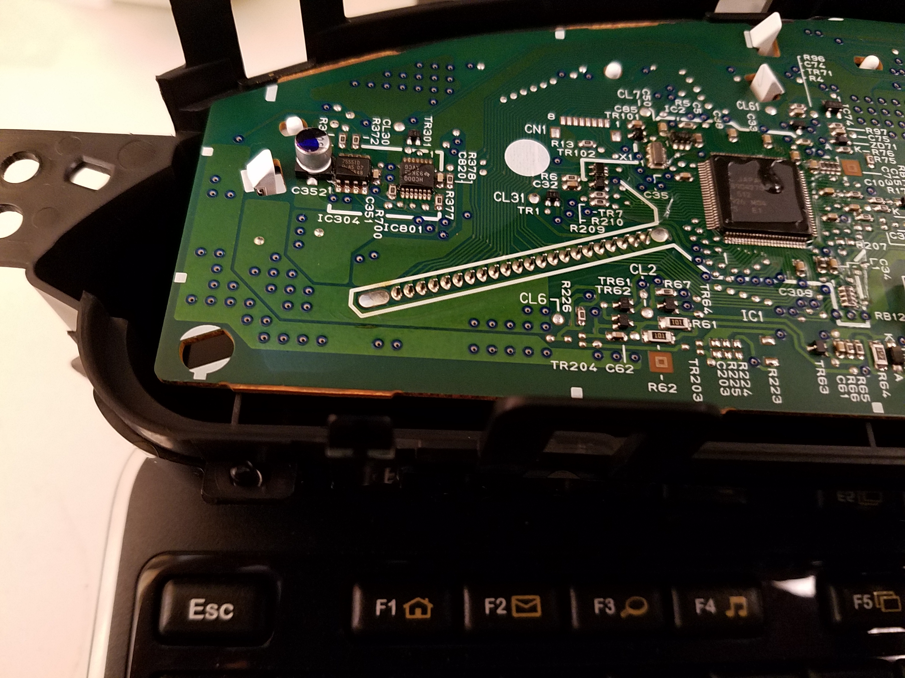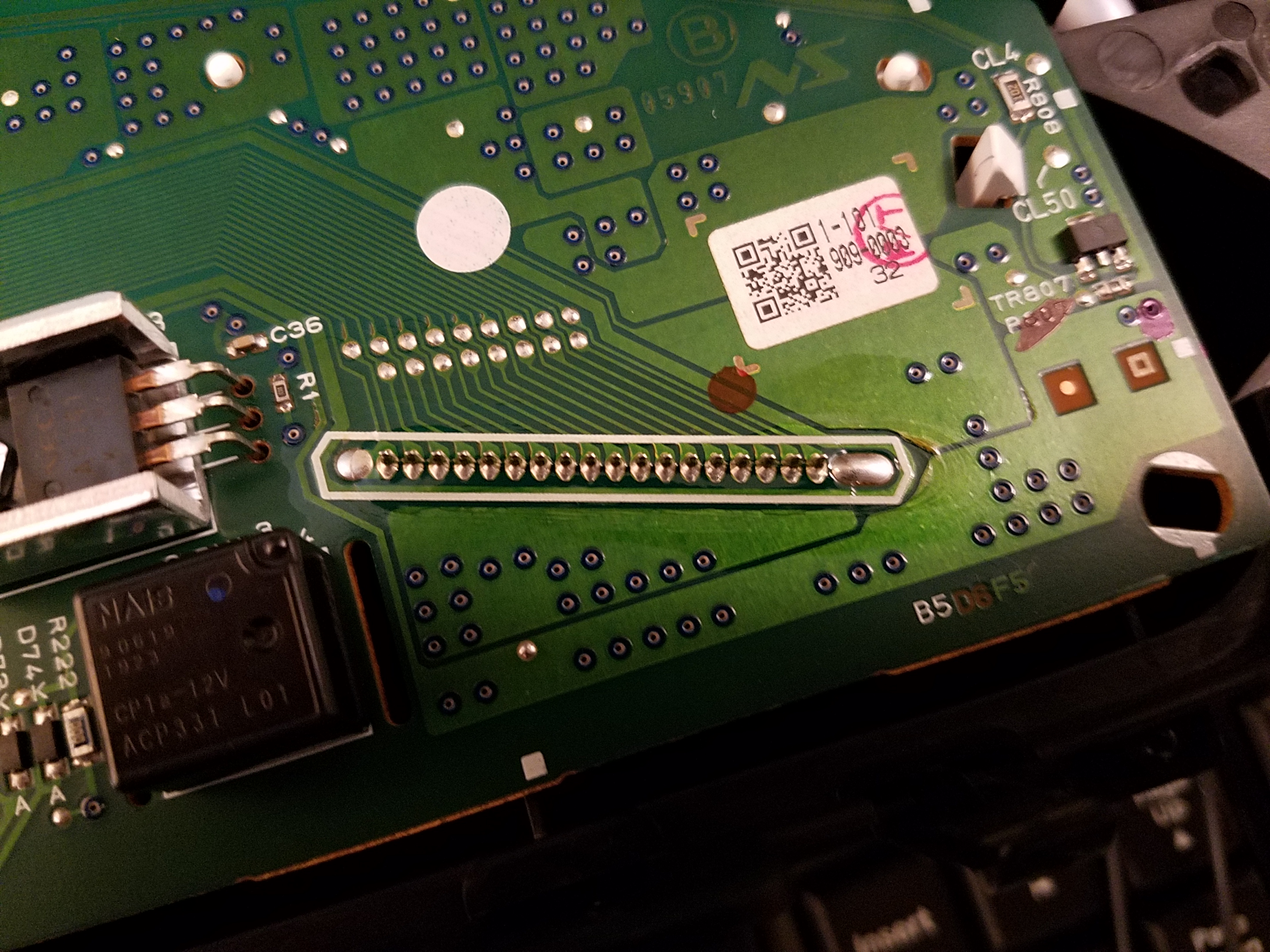 This seems like a common problem, so I thought I would post it here. This cluster also had one flickering segment in the speedometer display. There are three LCDs in this cluster, and there were cracked solder joints for the fuel gauge (image 1) and speedometer (image 2) LCDs. The temperature gauge LCD (image 3) looked okay, but I resoldered all three LCDs. There is conformal coating over most of the solder joints on this board, so that should be removed first. It does melt with heat, but melting through it with the soldering iron isn't the best idea.