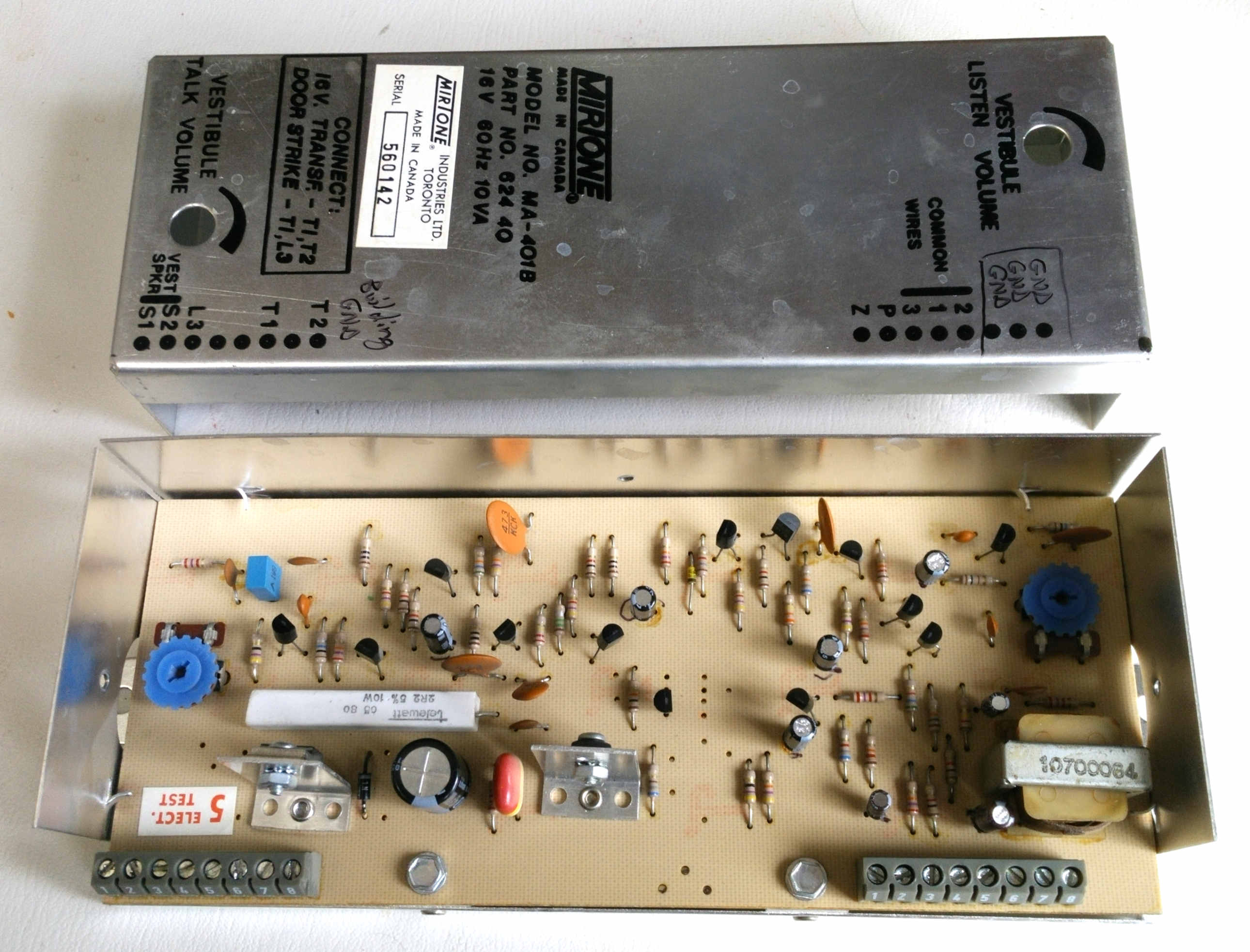 Mirtone MA-401B apartment intercom amplifer that would squeal/yelp/chirp when you pressed the Listen button. Now it just oscillates a steady tone when you press Listen and you can't hear anyone from the vestibule.