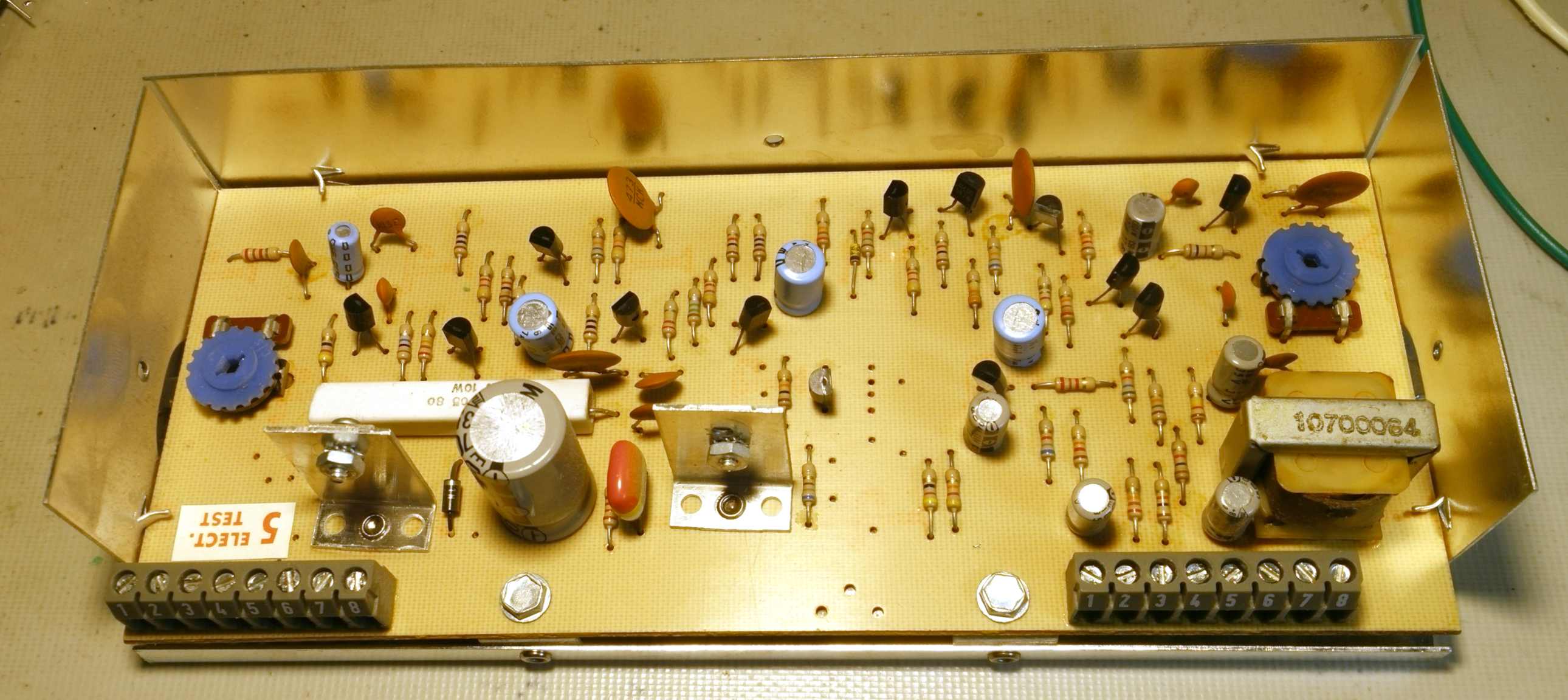 Date code 1980 with 10 mostly Marcon electrolytics and 13 discrete transistors and a triac for the door solenoid. It has a 7812 for +12VDC power and 16VAC input. I found one open 22uF cap but replaced all of them, it is running 40 years 24/7.
