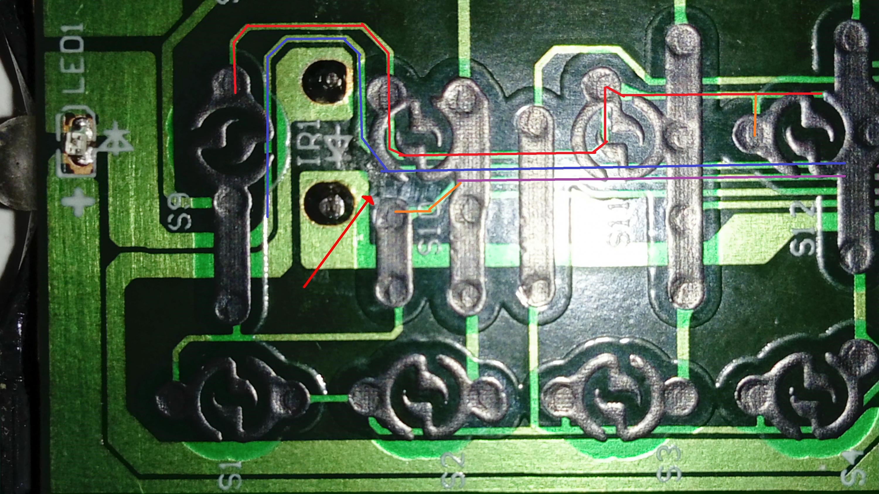 i tested board in diode mode and buttons are working, they show some ohm values, like all other buttons, but ir signal is not sent and on remote have nice feature - led light turning on after every press of buttons. these buttons do not trigger light nor ir signal.