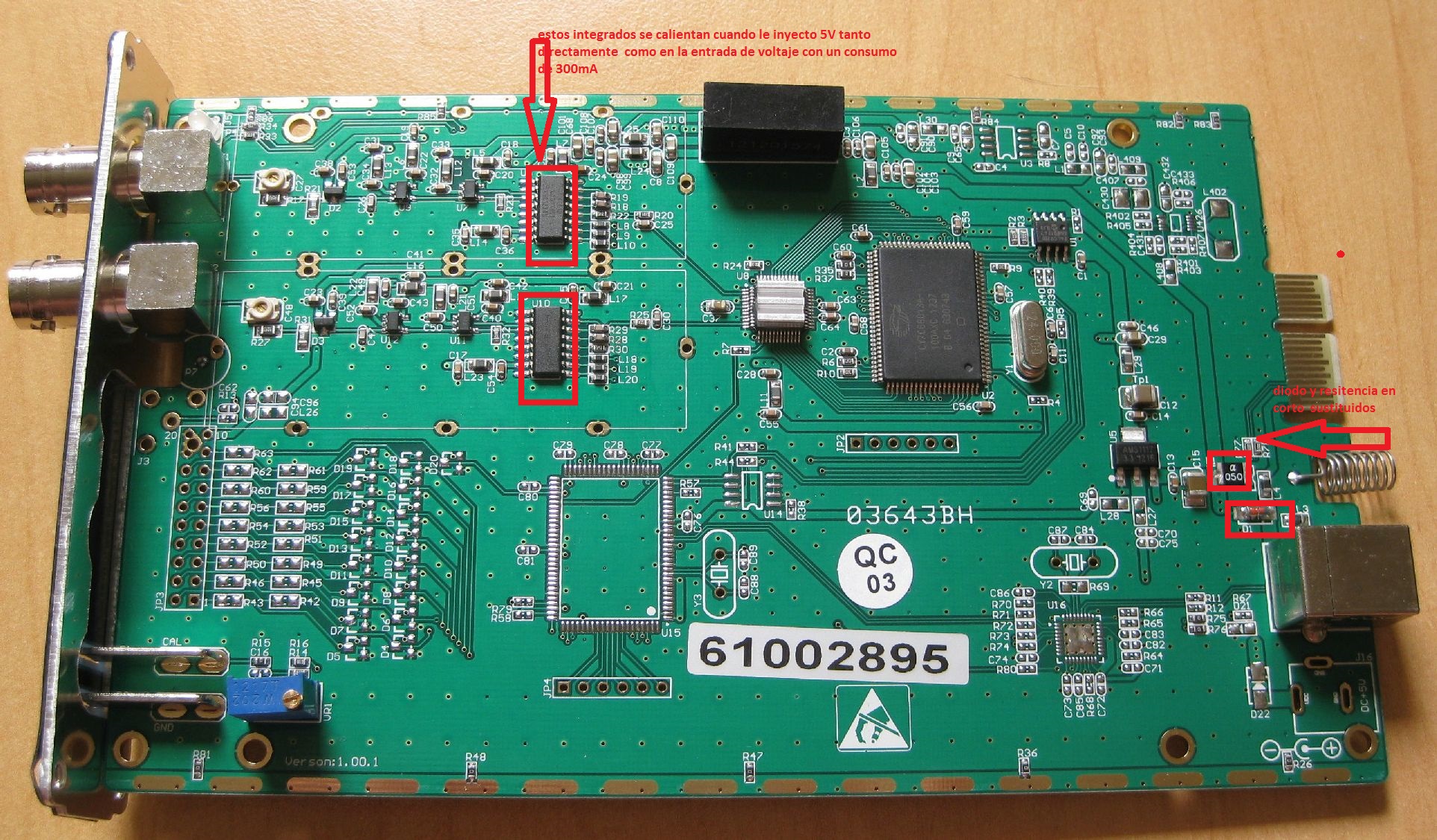 Injection 5V (With regulated source) at the input and gives me a consumption of 300 mAh and two integrated with 74HC4051 license plate (multiplexer and demultiplexer) are heated, each of these integrated corresponds to the input of the oscilloscope probes