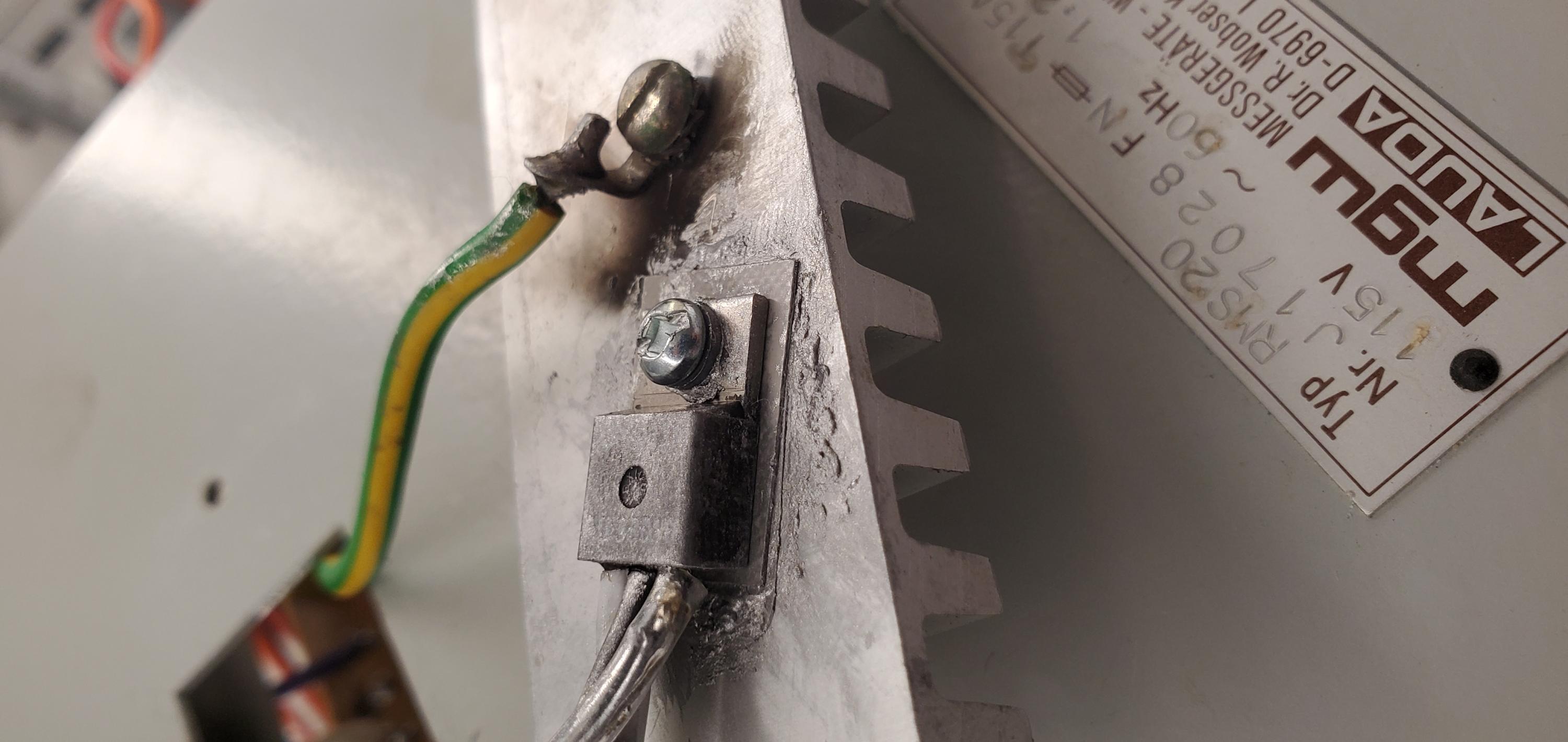 obviously it was shorting to the heat sink by the way its burned the aluminium check the earth connection as it looks burned . i would drill and tap a new screw hole and move the triac to a flat bit .Comment