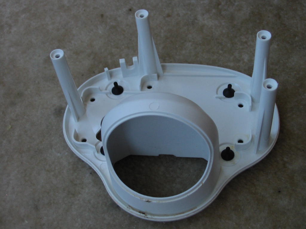 Instead, all that is needed here is to remove 2 screws holding the “pressure hose” and then 4 more screws from the bottom of the case. However, this still won't allow the bottom cover to come off. Once all of the screws are removed, pulling force has to be asserted onto the bottom cover, after which there are 4 small rubber feet that need to be pushed in with a small screwdriver to separate the pump base assembly from the bottom cover. The result is this:Bottom cover: