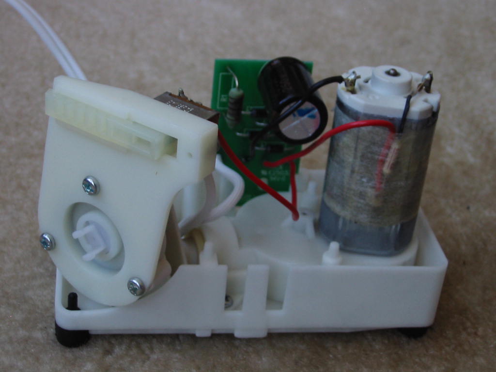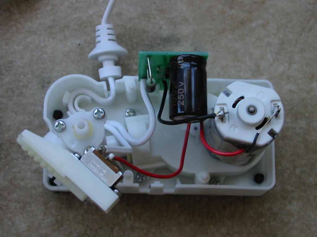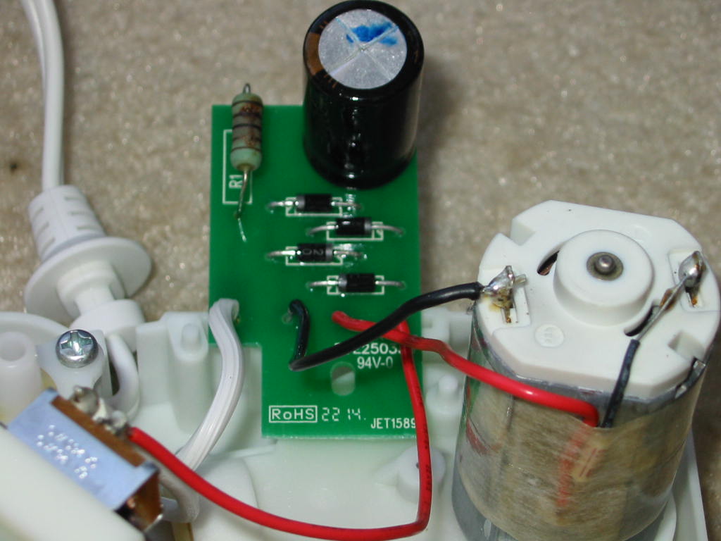 I think that leaves a little more to be desired for the quality of the rest of the device. The pump and gears, for example, are all plastic.Moving onto the circuit board - there's not much to it: four diodes for a full-bridge rectifier, an electrolytic cap for filtering the rectified DC, and a fusible MOX resistor in series with the Neutral line. Live is connected to a 3 Amp, 125VAC switch before going into the circuit board.