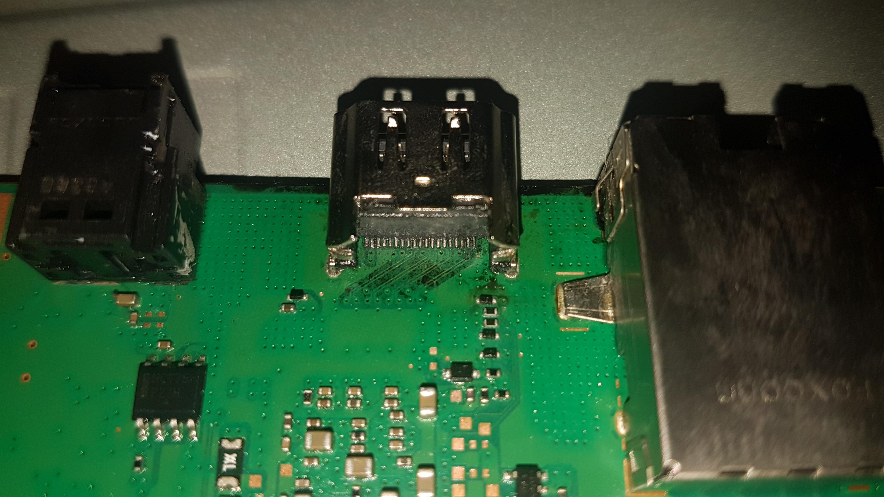 Hi, ill try to keep this short. I got my hands on a PS4 with a mangled HDMI port and assumed that it would be an easy fix. before the replacement it booted up fine (white light) however after replacing the port it booted up fine for 2 times and then after plugging in an HDMI cable and turning on the console to check whether it had video out it never booted again, even after unplugging the cable. now it gets stuck on the blue flashing light and after 25-40 seconds it pops out the disk (if one is inserted) and shuts itself off. Upon investigating i found that the capacitors near the HDMI port are all shorted and so are the ones close to the APU (although the ones close to the APU might always read this way not sure) all the data pins and power pins on the new HDMI port seem to also be shorted to GND, visually they do not look shorted however im new to SMD soldering. I definately heated the board for way too long to remove the old port as the Pcb got somewhat charred (maybe this killed the HDMI encoder and shorted everything?) i fail to understand how the PS4 has gotten the BLOD as a short would usually result in the ps4 turning off almost instantly not 25-40 seconds.